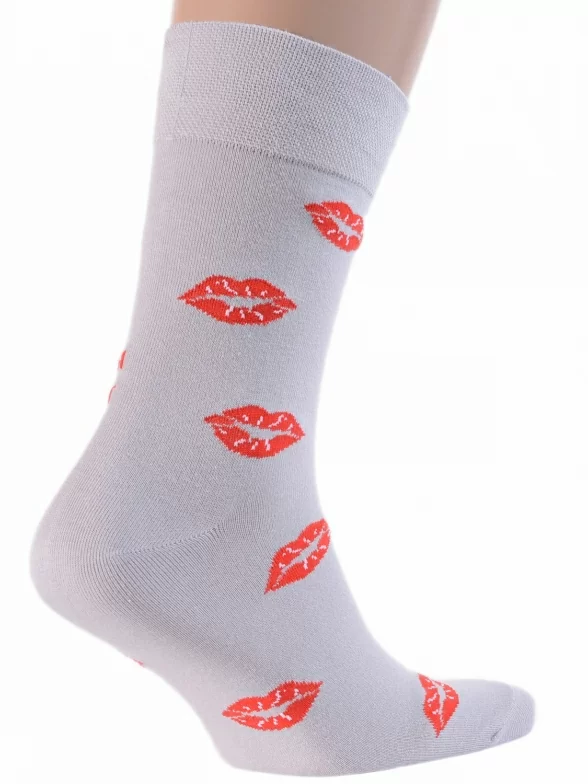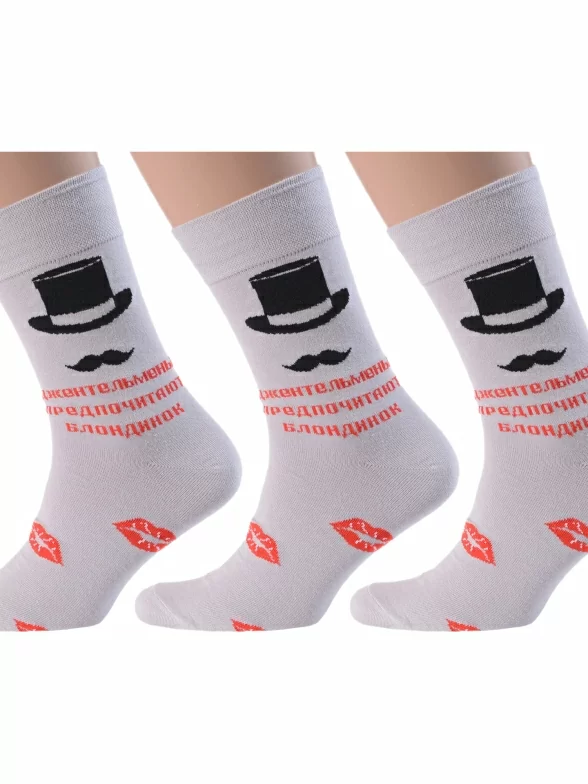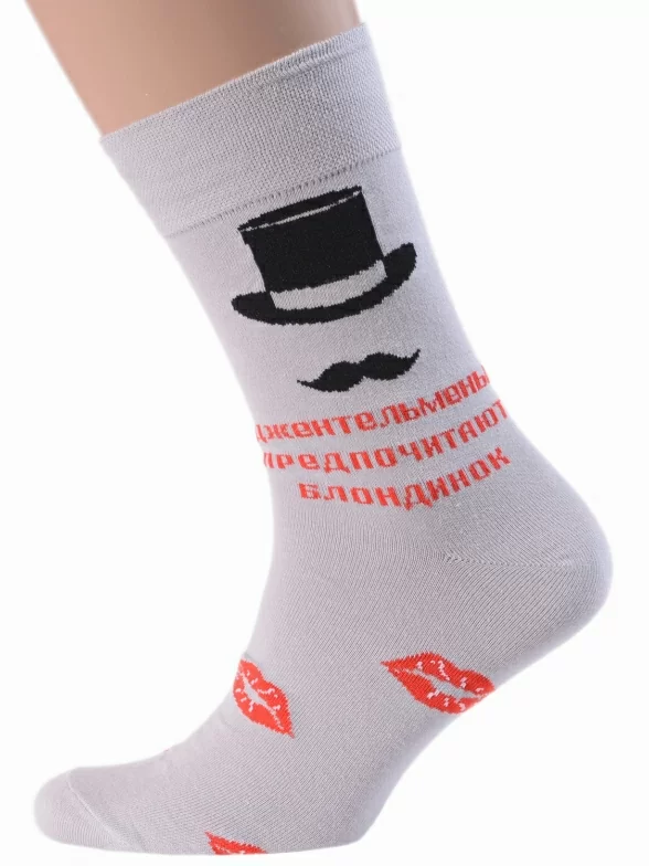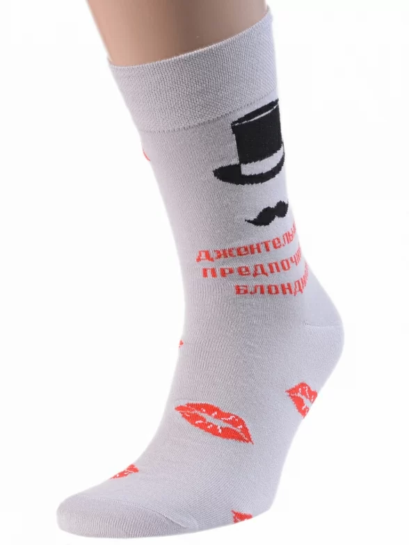 Комплект мужских носков бренда MSCLUB с узором в виде женских губ, шляпы с усами и с надписью "Джентльмены предпочитают блондинок". Главный принт расположен только с одной лицевой стороны, по этому признаку можно отличить левый и правый носок в паре. Модель средней длины с двойным бортом (манжетом резинки) и ощутимым уплотнением в месте шва на мыске.