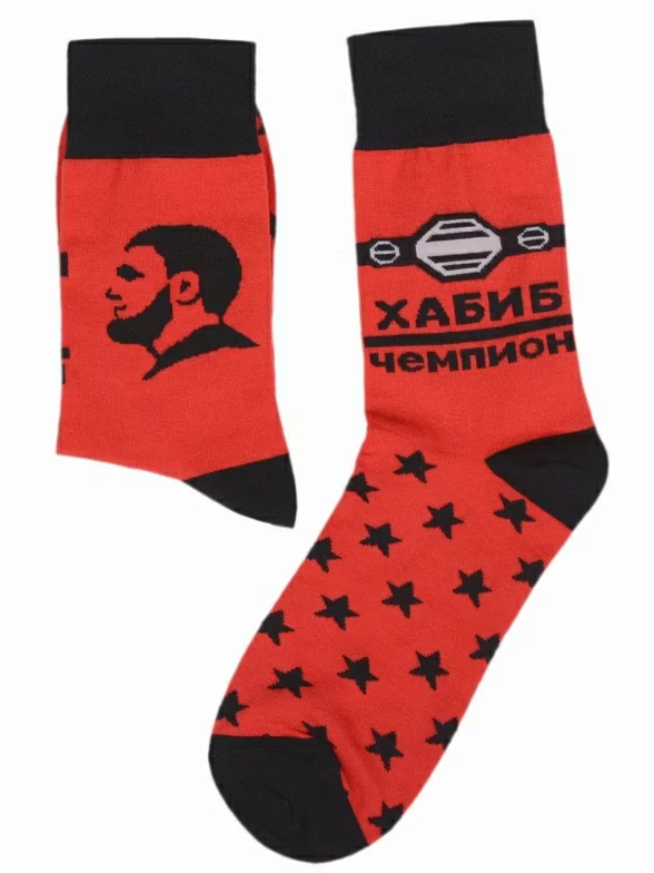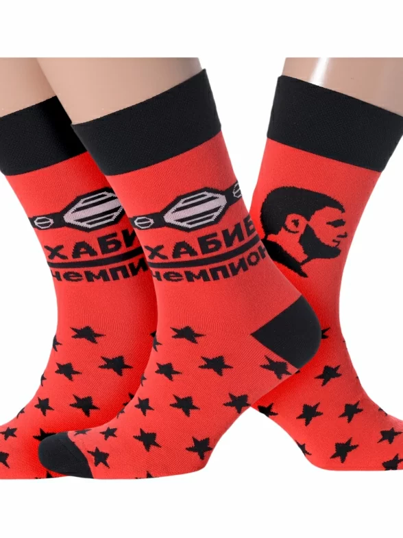 Комплект мужских носков бренда MSCLUB с принтом на спортивную тематику: с изображением российского бойца Хабиба Нурмагомедова - на одной стороне носка, пояса чемпиона и надписи "Хабиб чемпион" - на другой.