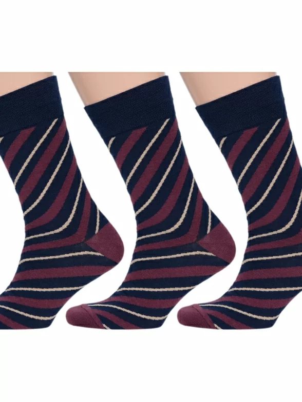 В комплект входят 3 одинаковые пары сине-бордовых носков, поставляются с индивидуальными фабричными этикетками в обычном или курьер-пакете.