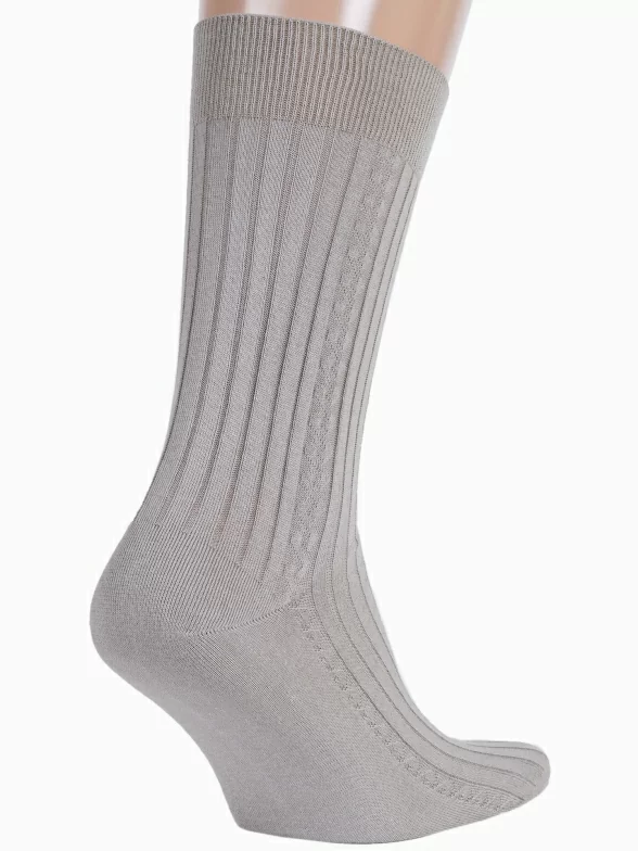 Изготовлены на российской фабрике "Орудьевский трикотаж" в Московской области из 100% хлопка. Модель средней длины связана в рубчик; имеет одинарный борт (манжет резинки) и неощутимый шов на мыске.