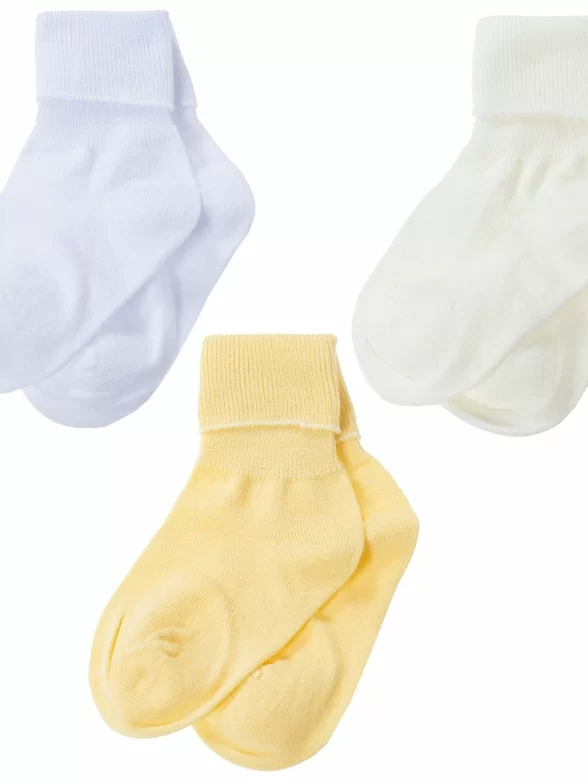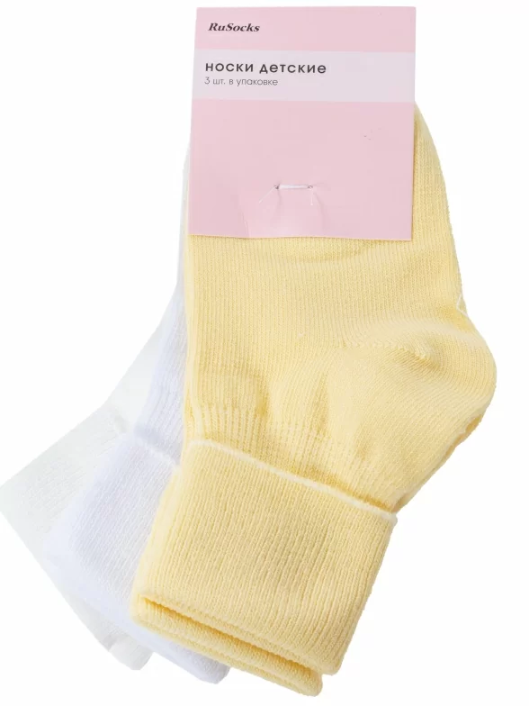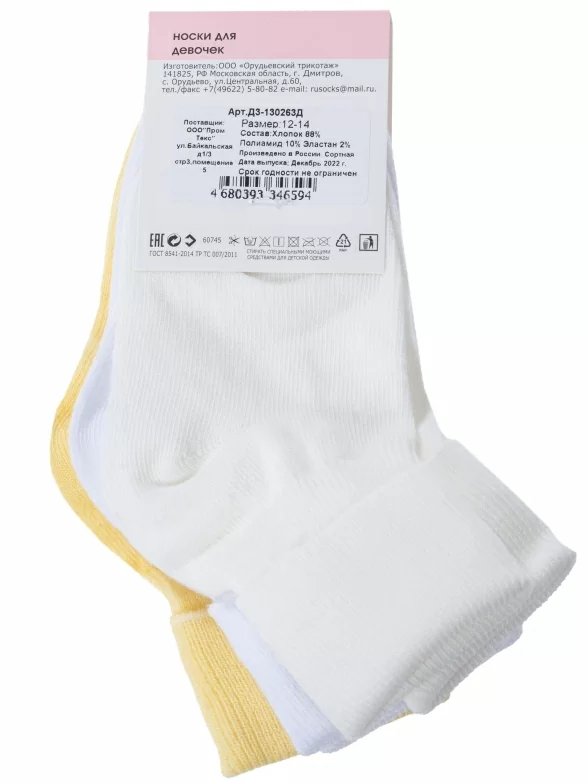 В комплект входят 3 пары носков арт. Д3-130263Д: по 1 паре белого, кремового и желтого цветов. Поставляются с единой фабричной этикеткой в обычном или курьер-пакете.