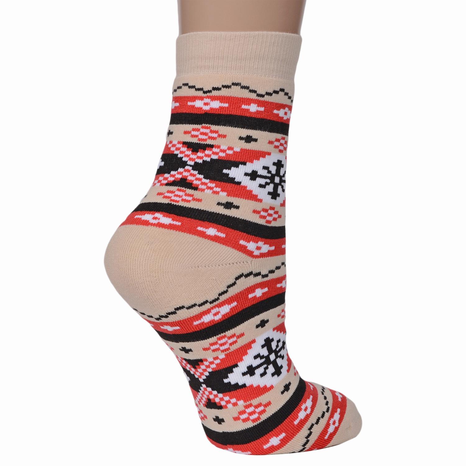 Изготовлены на российской фабрике из хлопка с добавлением полиамида и эластана для износостойкости изделия и комфортной посадки. Модель средней длины кремово-красного цвета с контрастным узором; имеет двойной борт (манжет резинки).