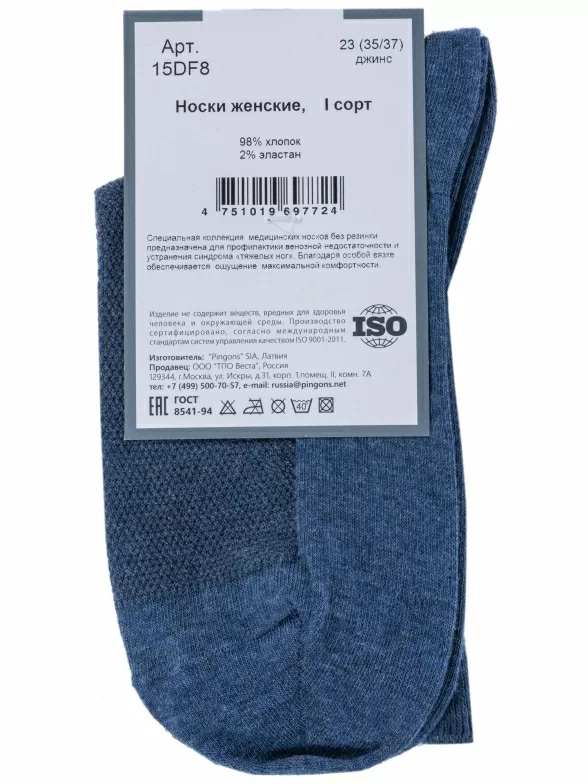 Модель средней длины джинсового цвета с плоским малоощутимым швом на мыске и без резинки, благодаря чему носки не пережимают ногу и не нарушают кровообращение. Задняя часть паголенка связана в мелкий рубчик, что обеспечивает надежную фиксацию носка на ноге, а передняя часть, начиная с подъема стопы, имеет сеточную вставку жаккардового плетения, что улучшает воздухообмен.