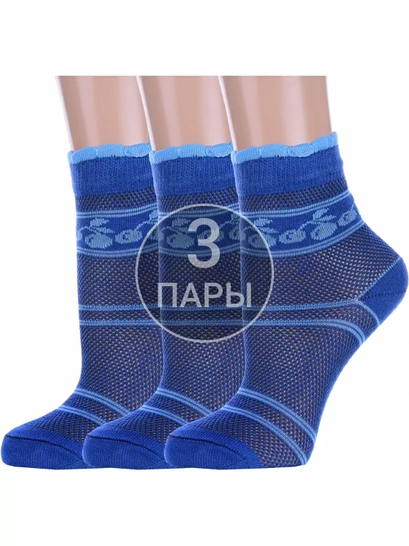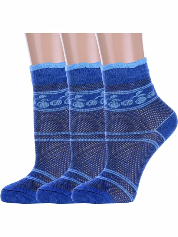 Комплект женских носков из 3 пар, летние, укороченные, цвет васильковый, в сеточку, повседневные, ажурные, шов обычный (не бесшовные), принт (рисунок): с узором, овощи / фрукты / ягоды, состав: 78% хлопок, 22% полиамид, арт. 3-А227. Производитель «ООО Альтаир, г. Орск, Оренбургская обл, Россия» под брендом «Альтаир».