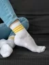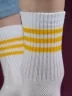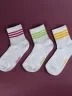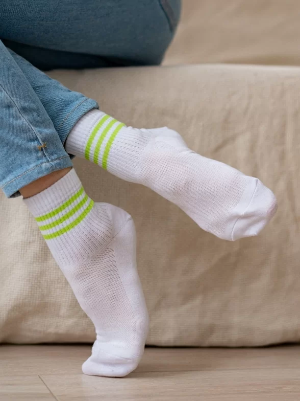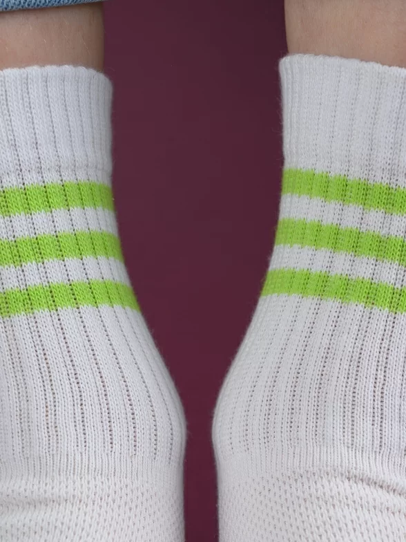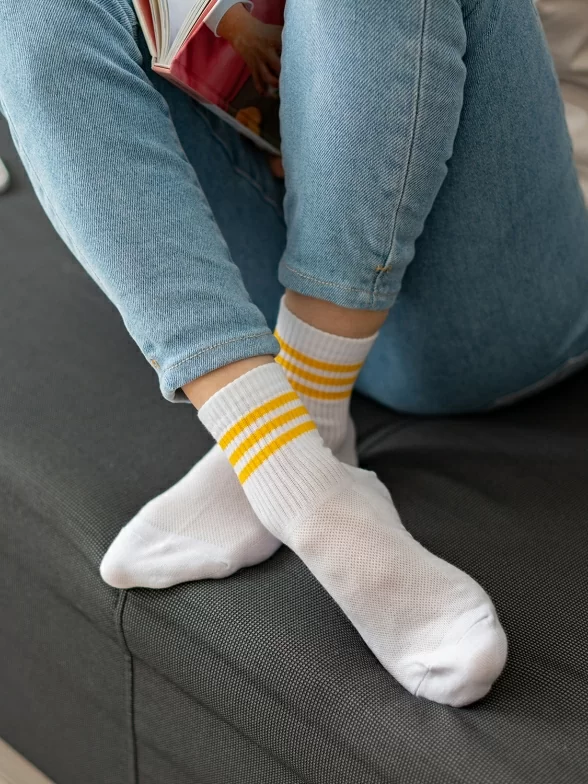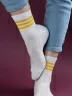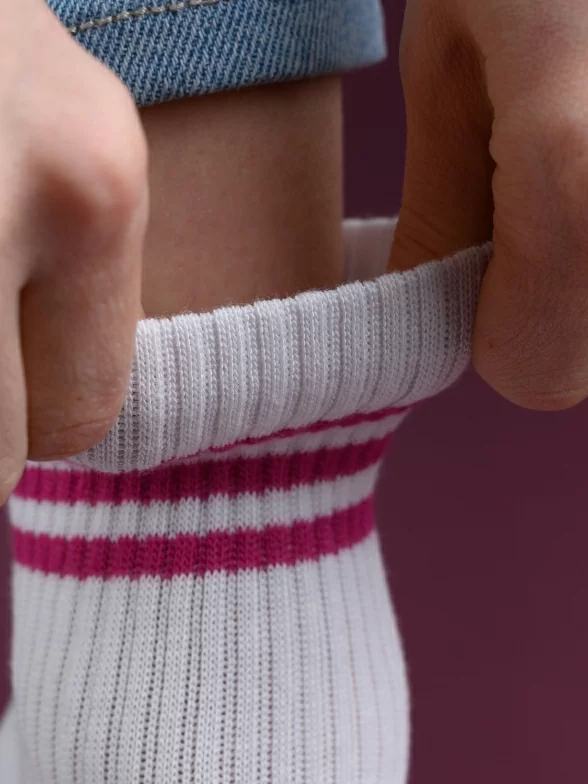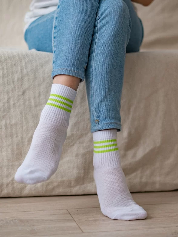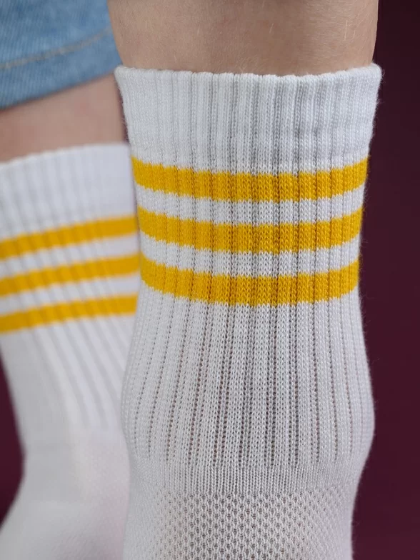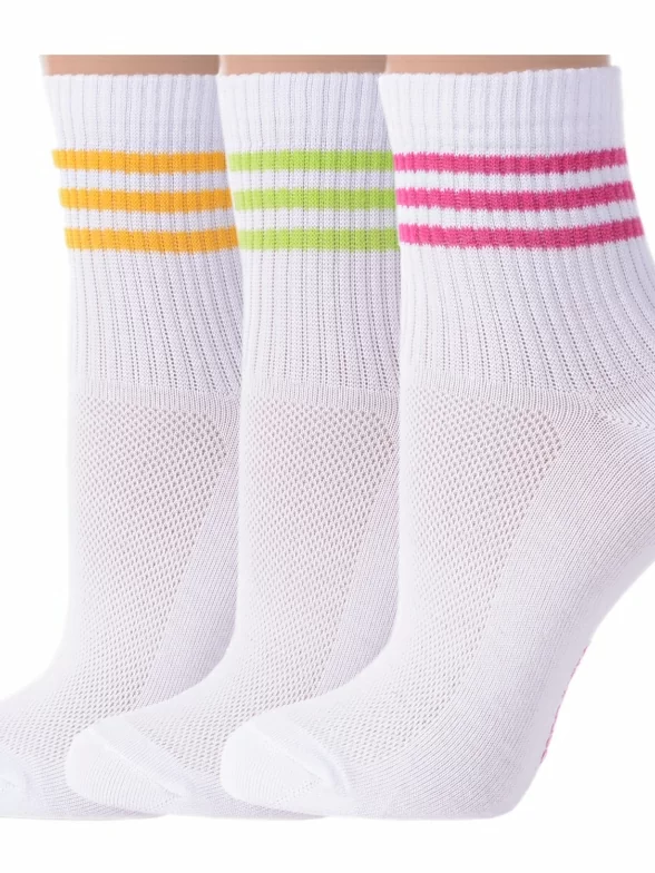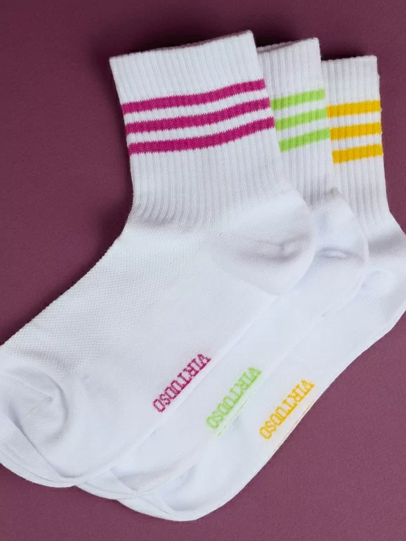 В комплект входит 3 пары белых носков с разными цветами полос под общей фабричной этикеткой.