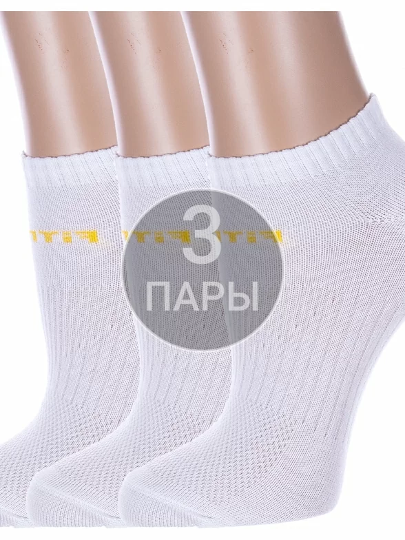 Комплект женских носков из 3 пар, круглогодичные, короткие, цвет белый с желтым, спортивные, в сеточку, шов обычный (не бесшовные), принт (рисунок): надписи, с узором, состав: 75% хлопок, 23% полиамид, 2% эластан, арт. 3-А217. Производитель «ООО Альтаир, г. Орск, Оренбургская обл, Россия» под брендом «Альтаир».