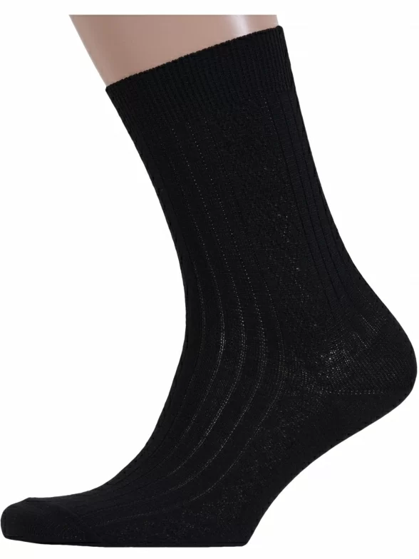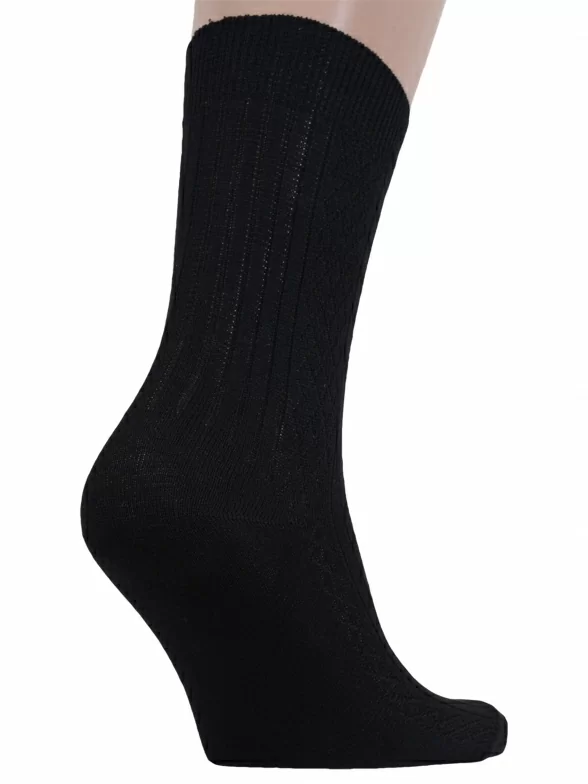 Модель однотонного черного цвета с узорной вязкой, однобортной резинкой и обычным швом на мыске.