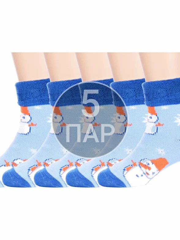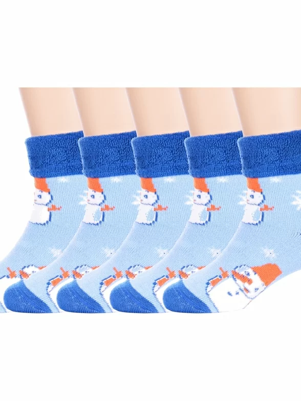 Комплект детских носков из 5 пар, межсезонные или зимние, укороченные, цвет синие, теплые, с принтом, с отворотом, махровые, состав: 90% хлопок, 7% полиамид, 3% эластан (лайкра), арт. 5-Л14. Производитель «ИП Мурзаков В.А., Ставропольский край, Россия» под брендом «Lorenzline».