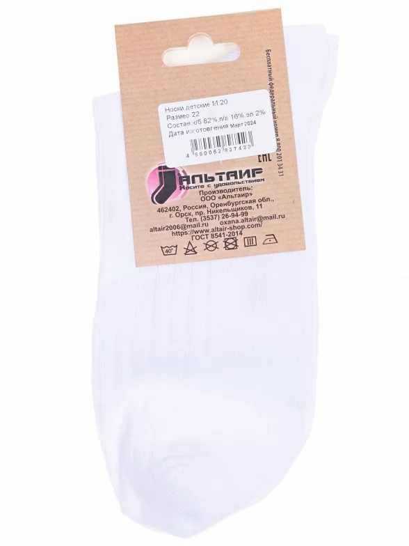 Комплект детских носков из 5 пар, круглогодичные, укороченные, цвет белый, классические, состав: 82% хлопок, 16% полиамид, 2% эластан, арт. 5-М20. Производитель «ООО Альтаир, г. Орск, Оренбургская обл, Россия» под брендом «Альтаир».