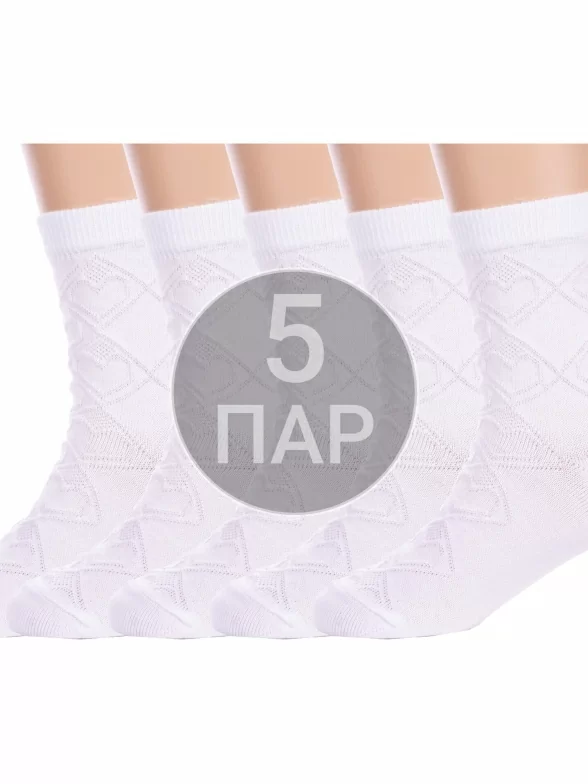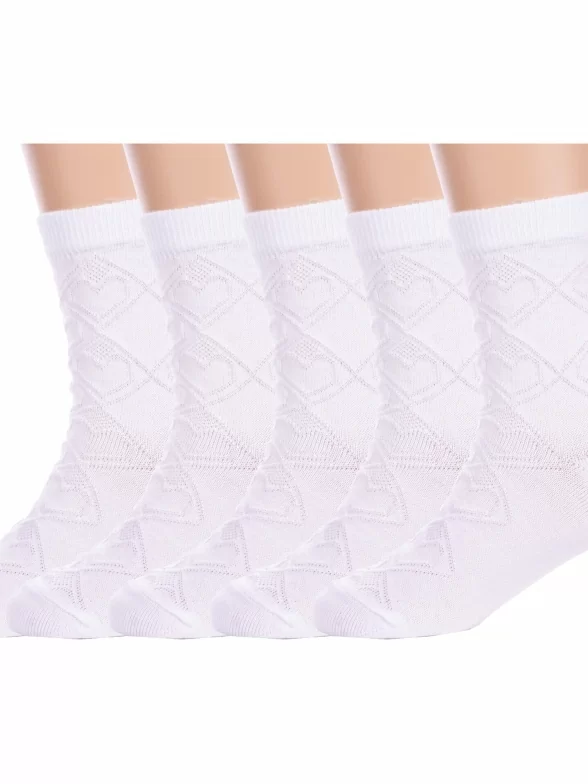 Комплект детских носков из 5 пар, летние, укороченные, цвет белый, ажурные, шов обычный (не бесшовные), принт (рисунок): сердечки / поцелуи / любовь, клетка, аргайл, с узором, однотонный, состав: 80% хлопок, 18% полиамид, 2% эластан, арт. 5-С35. Производитель «ООО Альтаир, г. Орск, Оренбургская обл, Россия» под брендом «Альтаир».