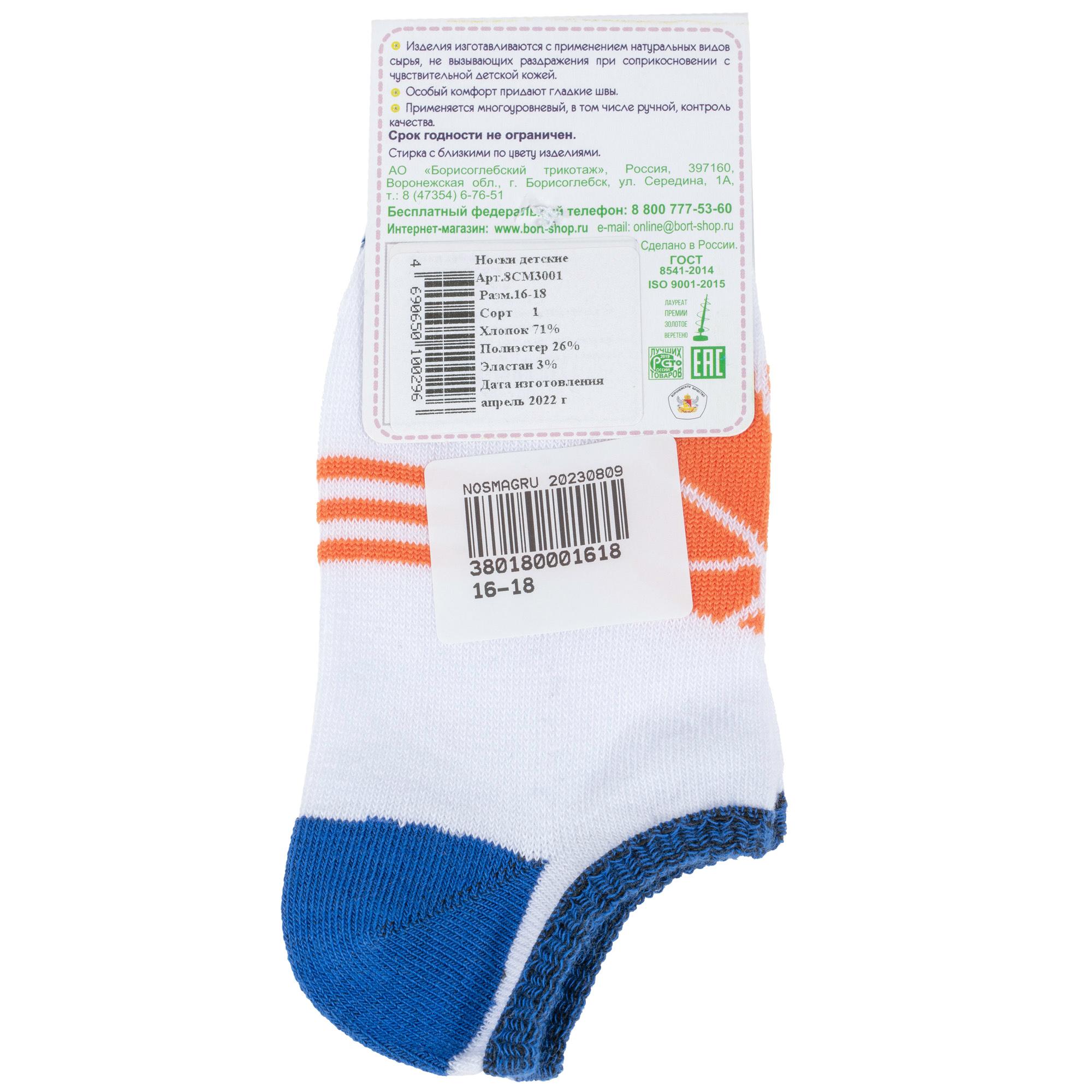 Комплект детских носков из 5 пар, круглогодичные, ультракороткие, цвет белый, спортивные, состав: 71% хлопок, 26% полиэстер, 3% эластан, фабричный артикул 5-8СМ3001. Производитель «АО Борисоглебский трикотаж, Воронежская обл, Россия» под брендом «Борисоглебский трикотаж».