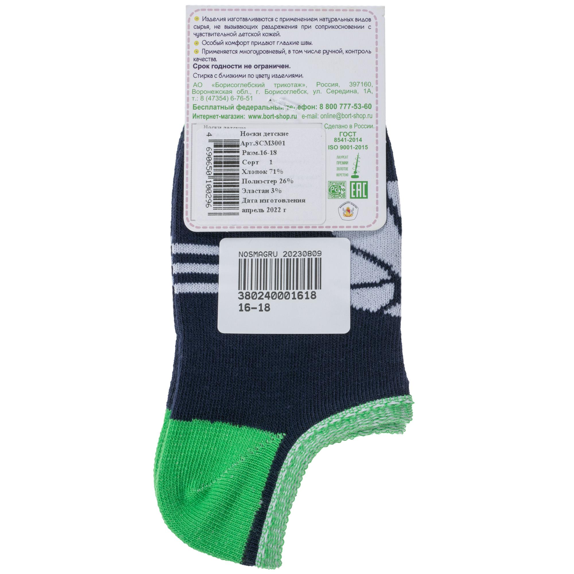 Комплект детских носков из 5 пар, летние, ультракороткие, цвет темно-синие, прикольные, состав: 71% хлопок, 26% полиэстер, 3% эластан, фабричный артикул 5-8СМ3001. Производитель «АО Борисоглебский трикотаж, Воронежская обл, Россия» под брендом «Борисоглебский трикотаж».