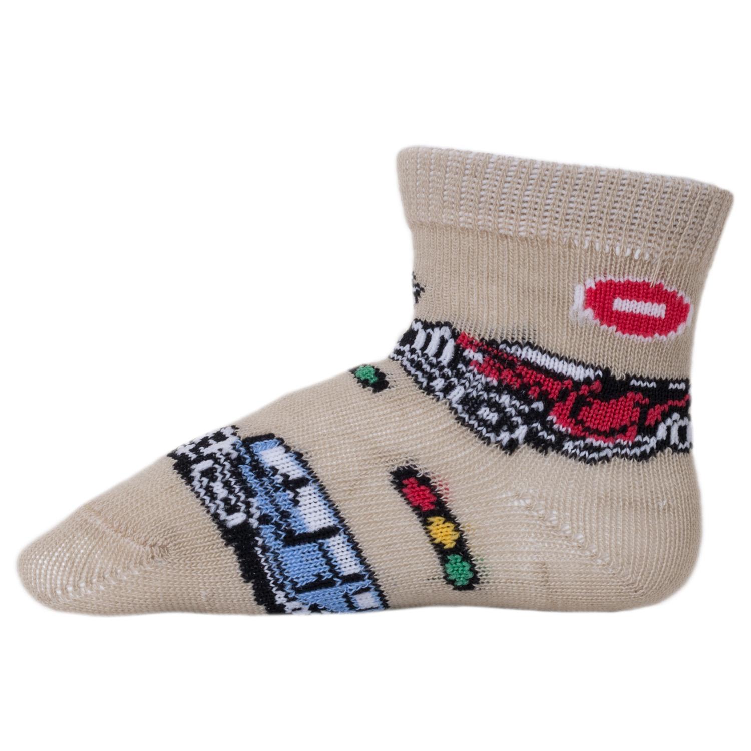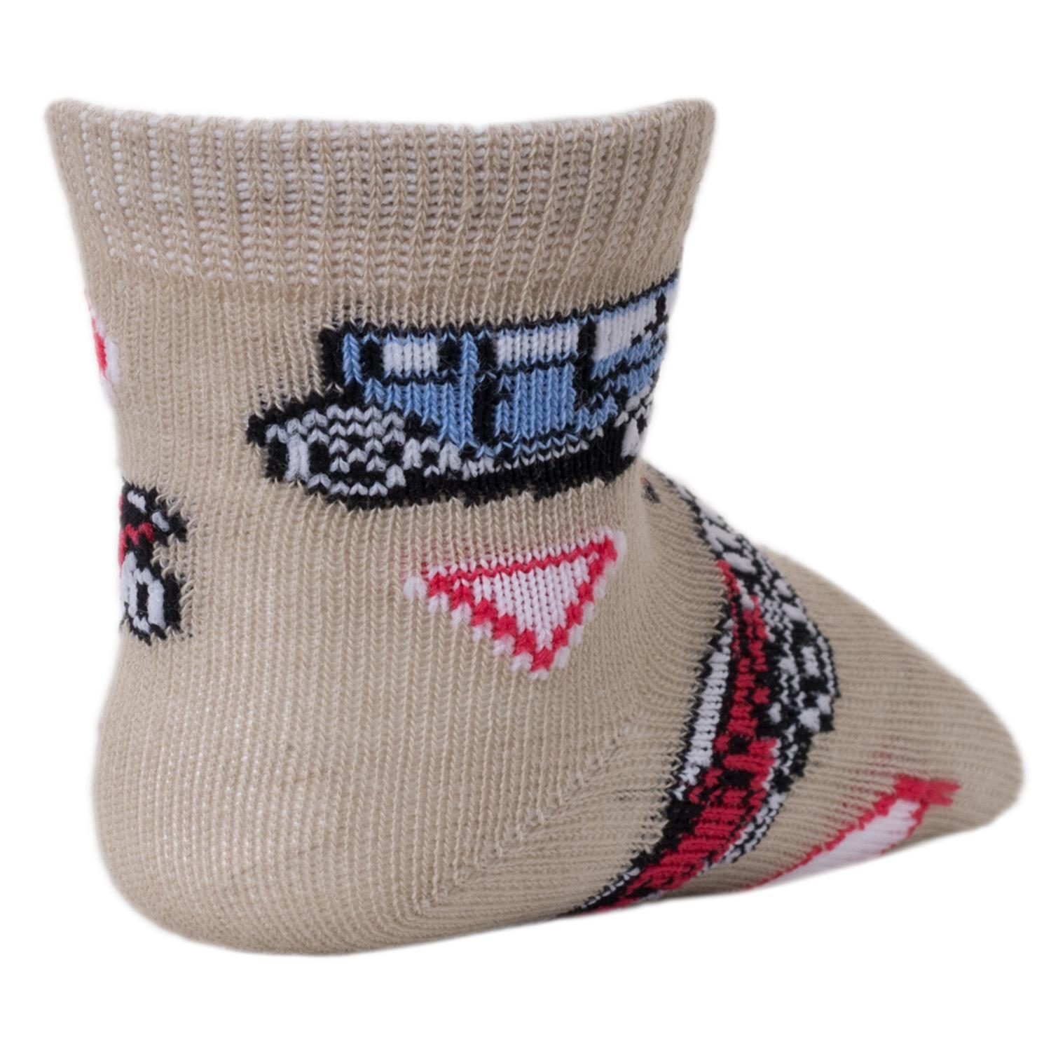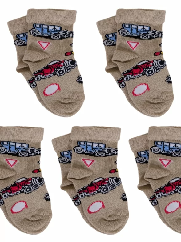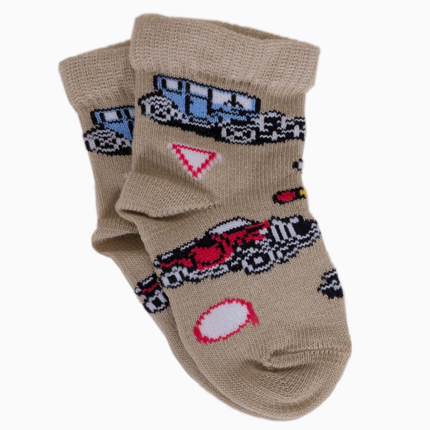 Модель средней длины с двойным бортом (манжетом резинки) и обычным швом на мыске; украшена принтом в виде машинок. Изготовлены на фабрике в Ставропольском крае из хлопка с добавлением полиамида и эластана для износостойкости изделия и комфортной посадки.