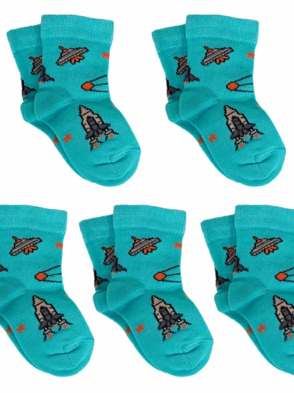 Модель средней длины с двойным бортом (манжетом резинки) и обычным швом на мыске; украшена космическим принтом. Изготовлены на фабрике в Ставропольском крае из хлопка с добавлением полиамида и эластана для износостойкости изделия и комфортной посадки.