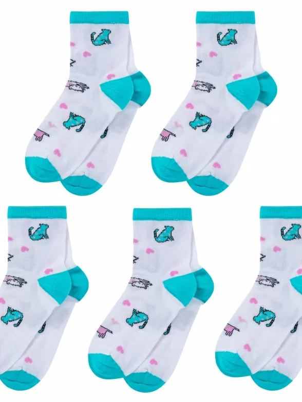 Модель средней длины с двойным бортом (манжетом резинки) и обычным швом на мыске; украшена принтом в виде котиков. Изготовлены на фабрике в Ставропольском крае из хлопка с добавлением полиамида и эластана для износостойкости изделия и комфортной посадки.