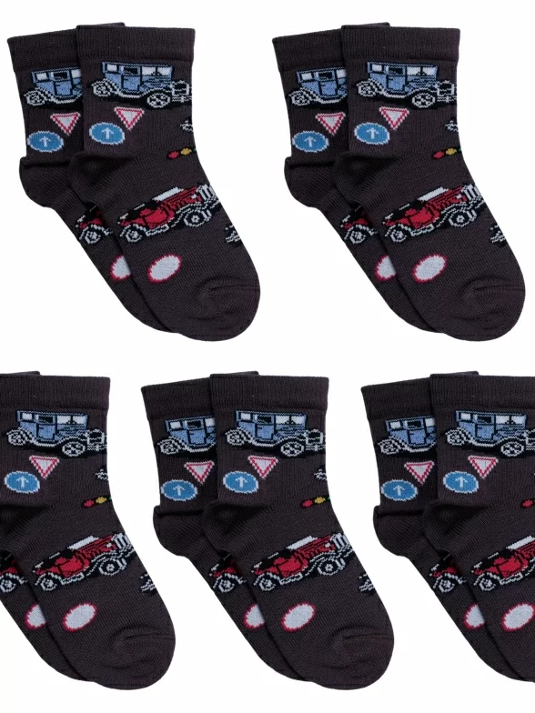 Модель средней длины с двойным бортом (манжетом резинки) и обычным швом на мыске; украшена принтом в виде машинок. Изготовлены на фабрике в Ставропольском крае из хлопка с добавлением полиамида и эластана для износостойкости изделия и комфортной посадки.