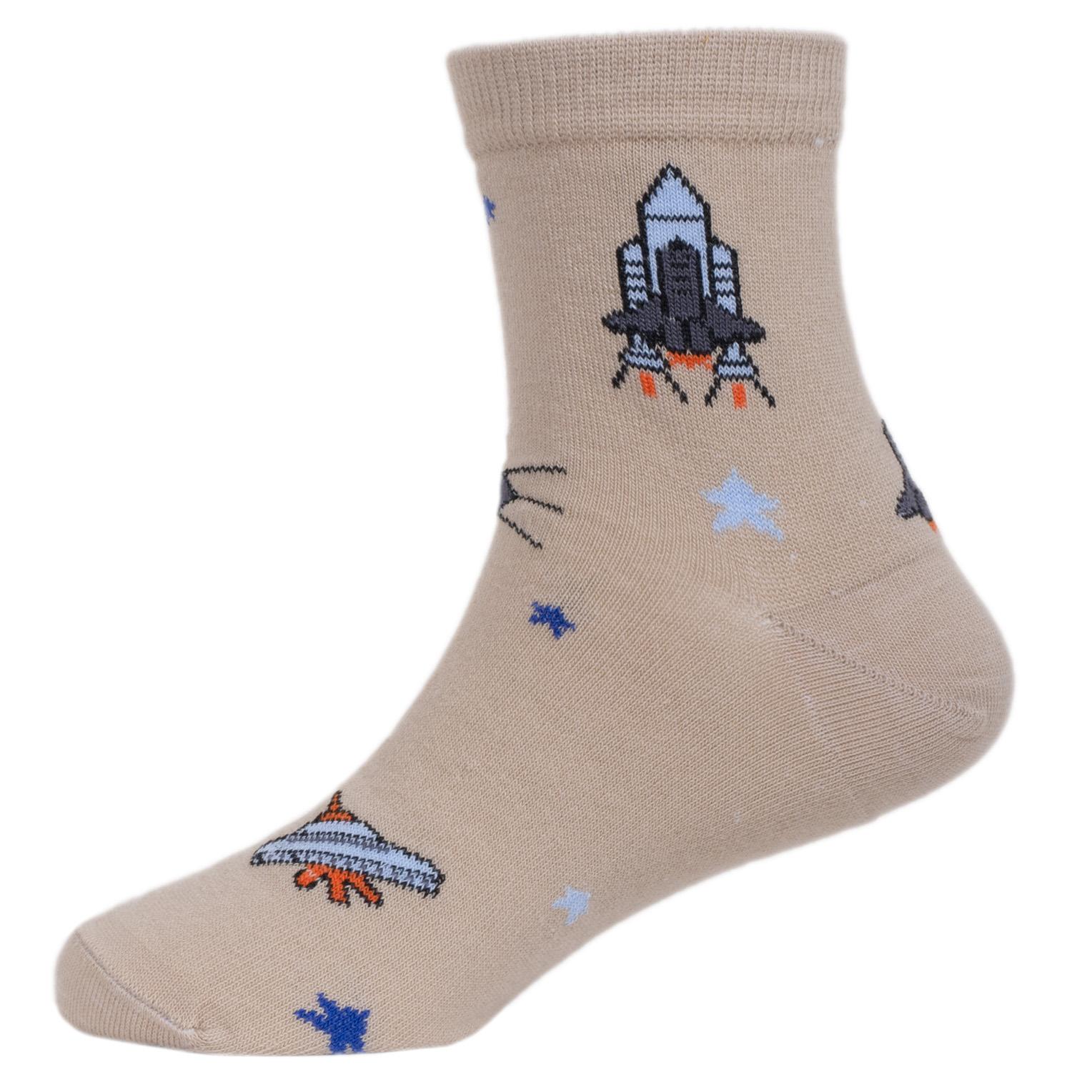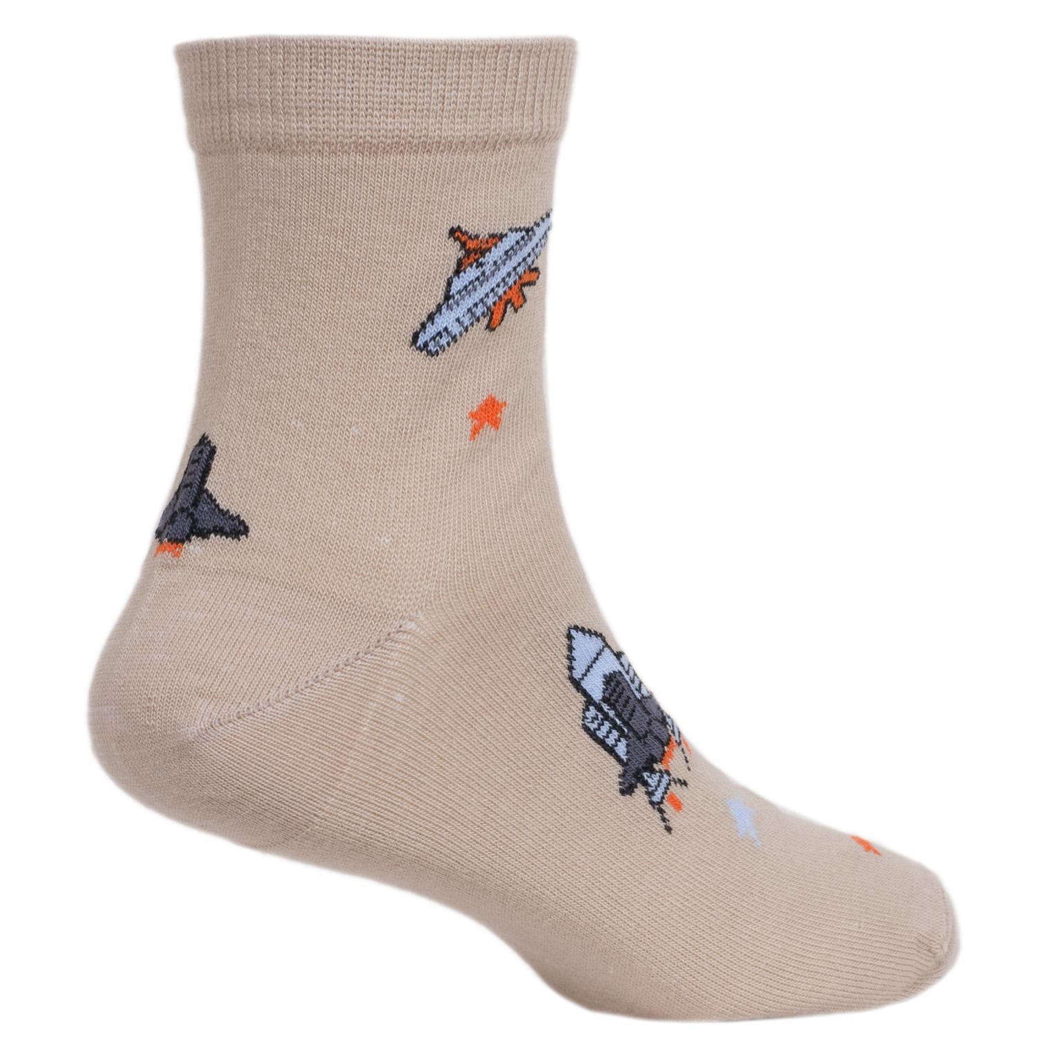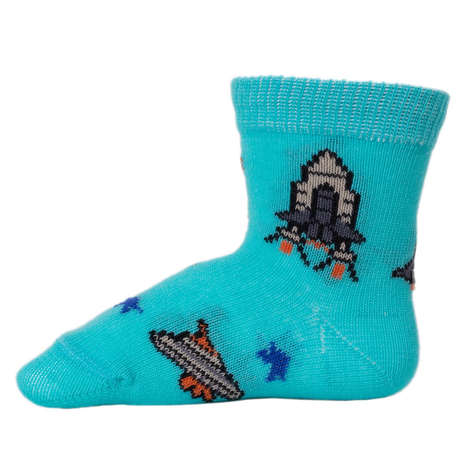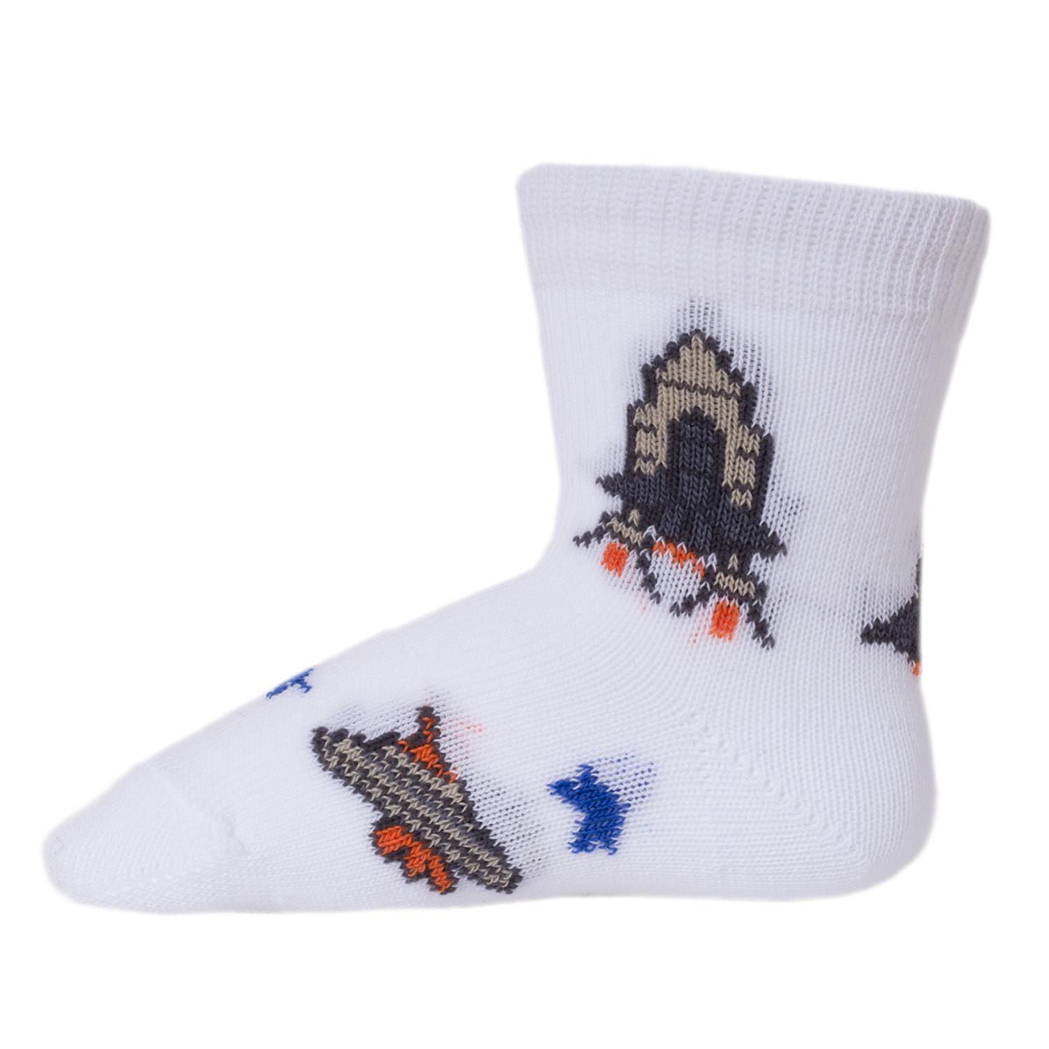 Модель средней длины с двойным бортом (манжетом резинки) и обычным швом на мыске; украшена космическим принтом. Изготовлены на фабрике в Ставропольском крае из хлопка с добавлением полиамида и эластана для износостойкости изделия и комфортной посадки.