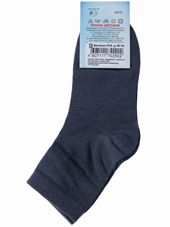 В комплект входит 5 пар носков артикула Л33 с индивидуальными фабричными этикетками: по 1 паре темно-серых и белых, 3 пары темно-синих.