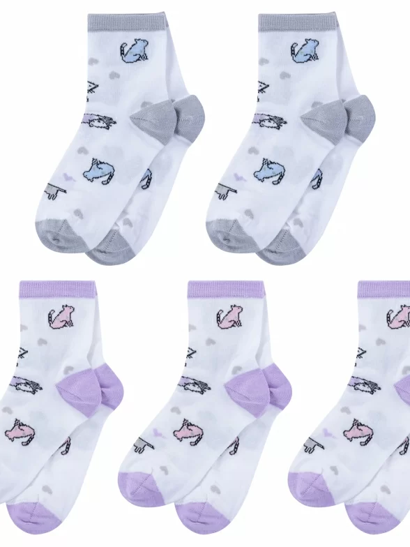 Слегка укороченная модель с двойным бортом (манжетом резинки) и обычным швом на мыске; украшена принтом в виде котиков. Изготовлены на фабрике в Ставропольском крае из хлопка с добавлением полиамида и эластана для износостойкости изделия и комфортной посадки. Процентное соотношение волокон: 90% хлопок, 7% полиамид, 3% эластан (лайкра).