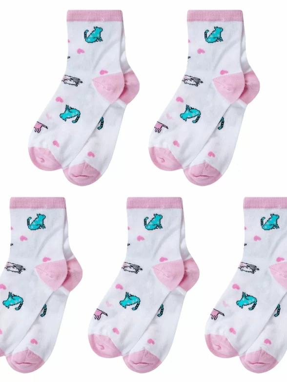 Модель средней длины с двойным бортом (манжетом резинки) и обычным швом на мыске; украшена принтом в виде котиков. Изготовлены на фабрике в Ставропольском крае из хлопка с добавлением полиамида и эластана для износостойкости изделия и комфортной посадки.