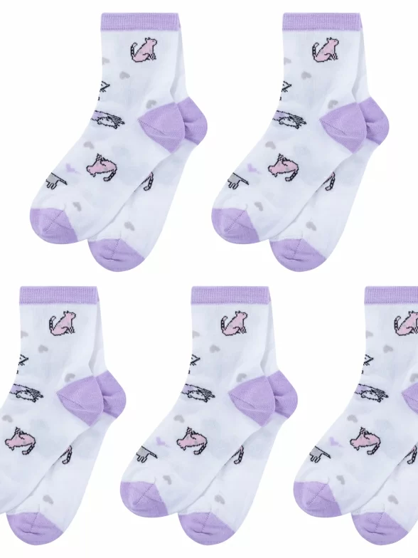Модель средней длины с двойным бортом (манжетом резинки) и обычным швом на мыске; украшена принтом в виде котиков. Изготовлены на фабрике в Ставропольском крае из хлопка с добавлением полиамида и эластана для износостойкости изделия и комфортной посадки.
