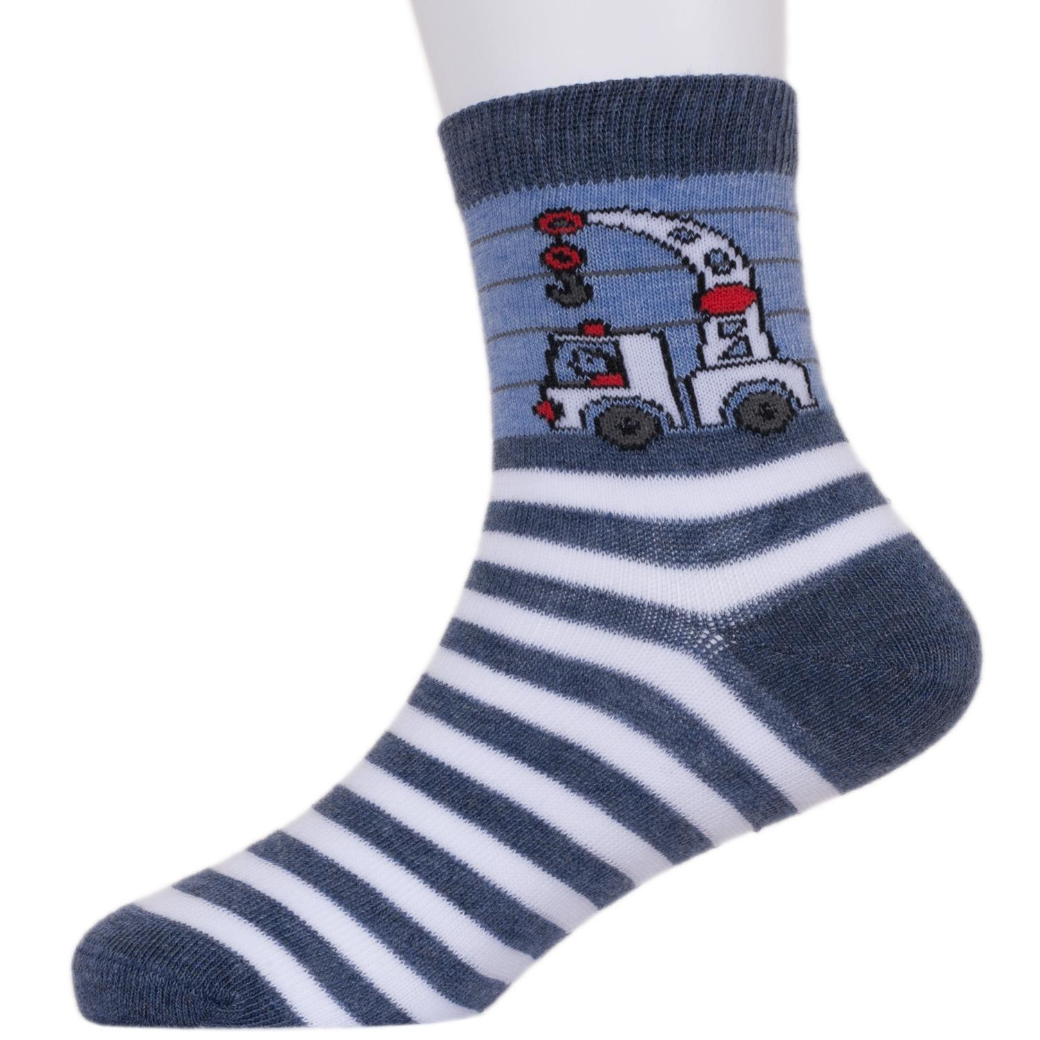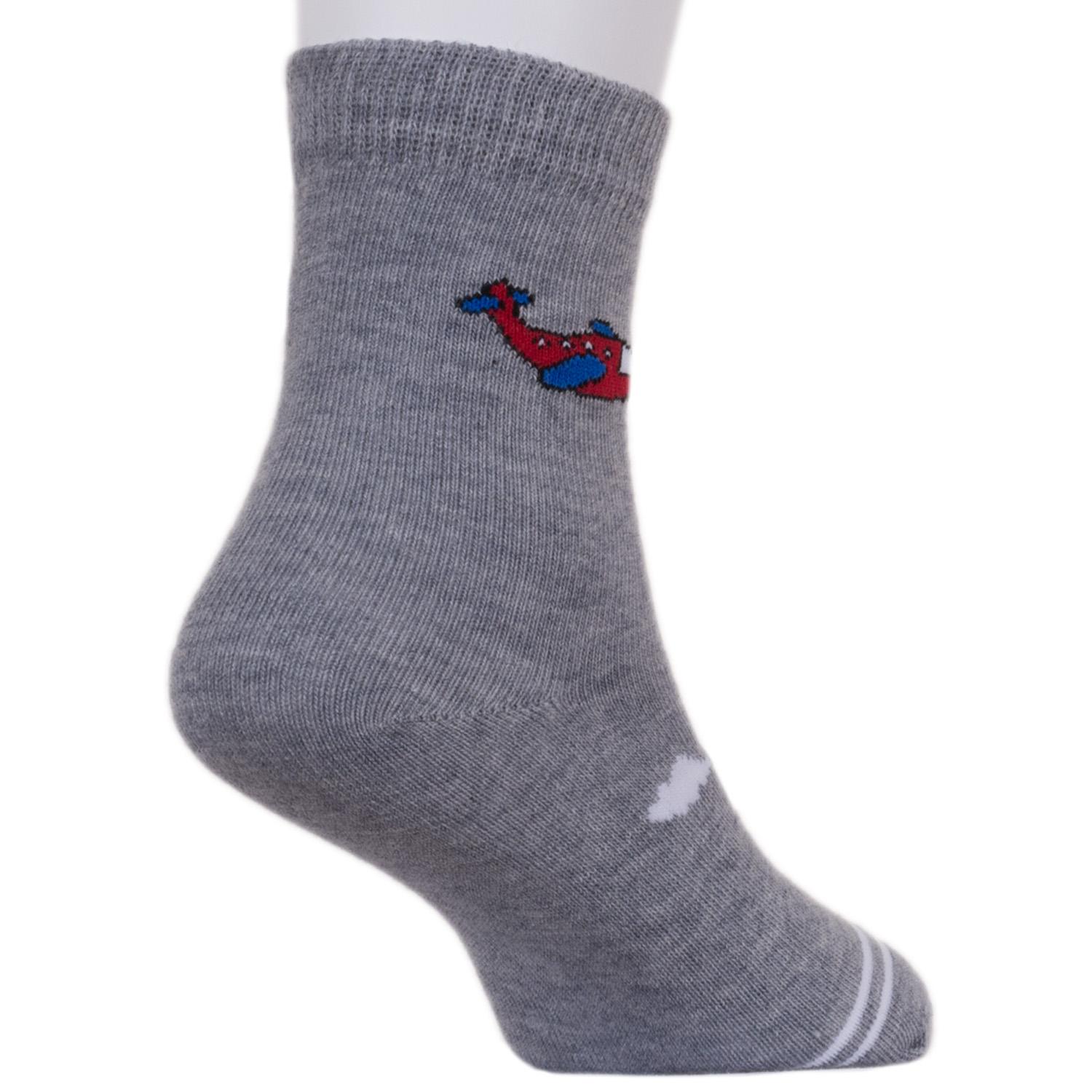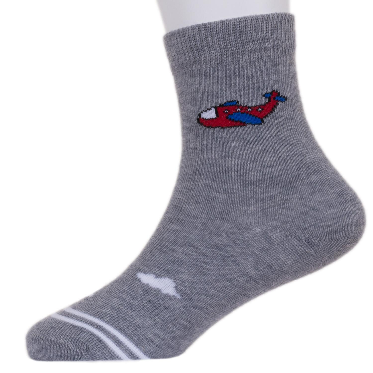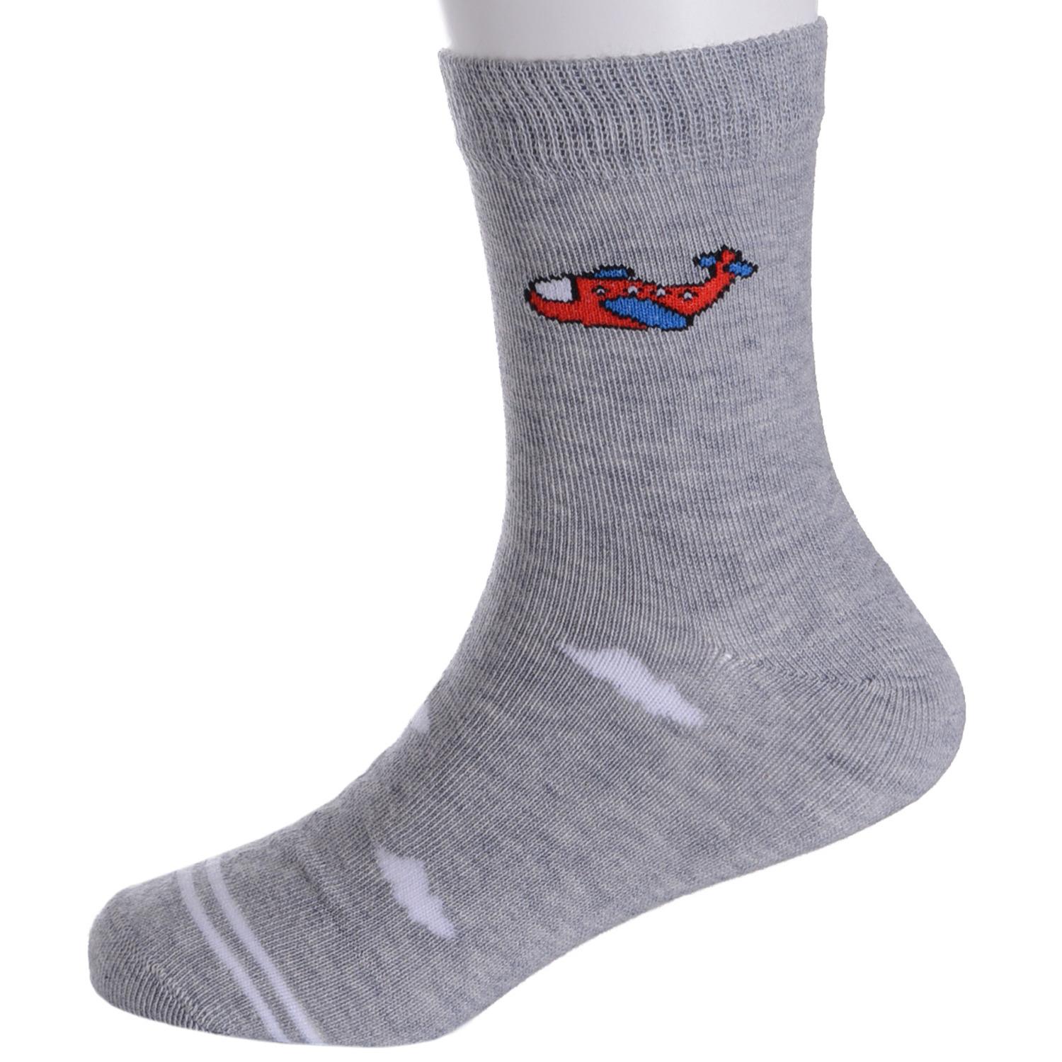 В комплект входят 5 пар носков с индивидуальными фабричными этикетками: 3 пары джинсового цвета с принтом в виде машинки и 2 серые пары с самолетиком.