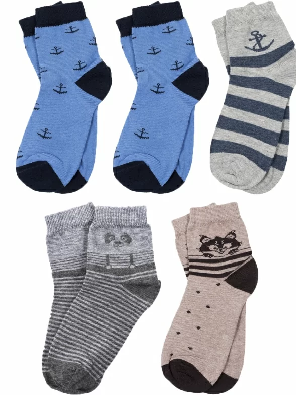 Комплект детских носков бренда RuSocks: 2 пары синих с якорями и по 1 пара бежевых в горох, серых в полоску с пандой и серых в полоску с якорем.