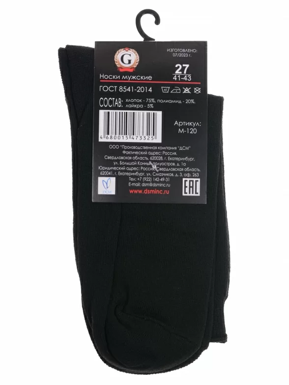 Комплект мужских носков из 5 пар, круглогодичные, средней длины, цвет черный, классические, шов обычный (не бесшовные), принт (рисунок): без рисунков/узоров, состав: 75% хлопок, 20% полиамид, 5% эластан (лайкра), арт. 5-М-120. Производитель «ООО Производственная компания "ДСМ", Россия» под брендом «Grand line».
