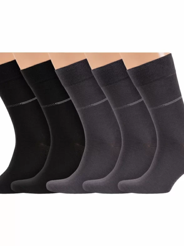 В комплект входит 5 пар носков артикула М-216 с индивидуальными фабричными этикетками: 2 пары черных и 3 пары темно-серых.