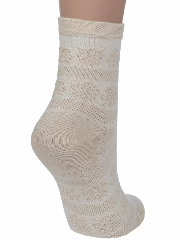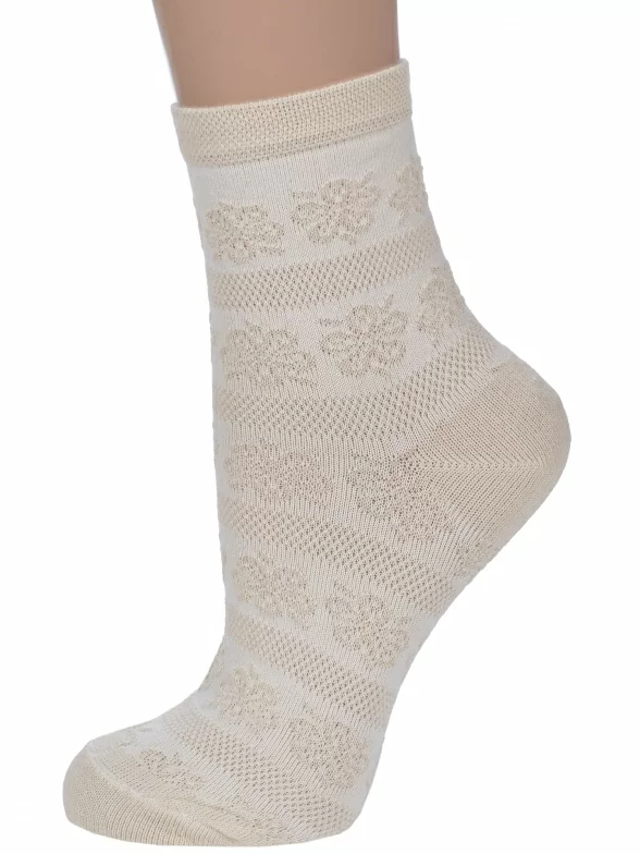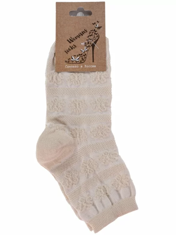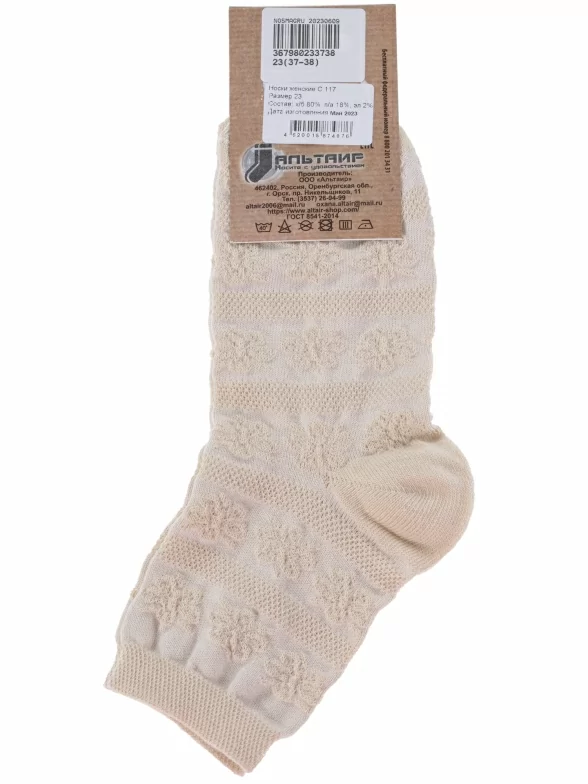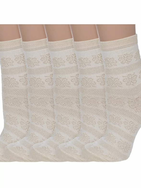Комплект женских носков из 5 пар, летние или круглогодичные, укороченные, цвет бежевый, повседневные, в сеточку, шов обычный (не бесшовные), принт (рисунок): цветы / растения, кружево (или имитация), с узором, состав: 80% хлопок, 18% полиамид, 2% эластан, арт. 5-С117. Производитель «ООО Альтаир, г. Орск, Оренбургская обл, Россия» под брендом «Альтаир».