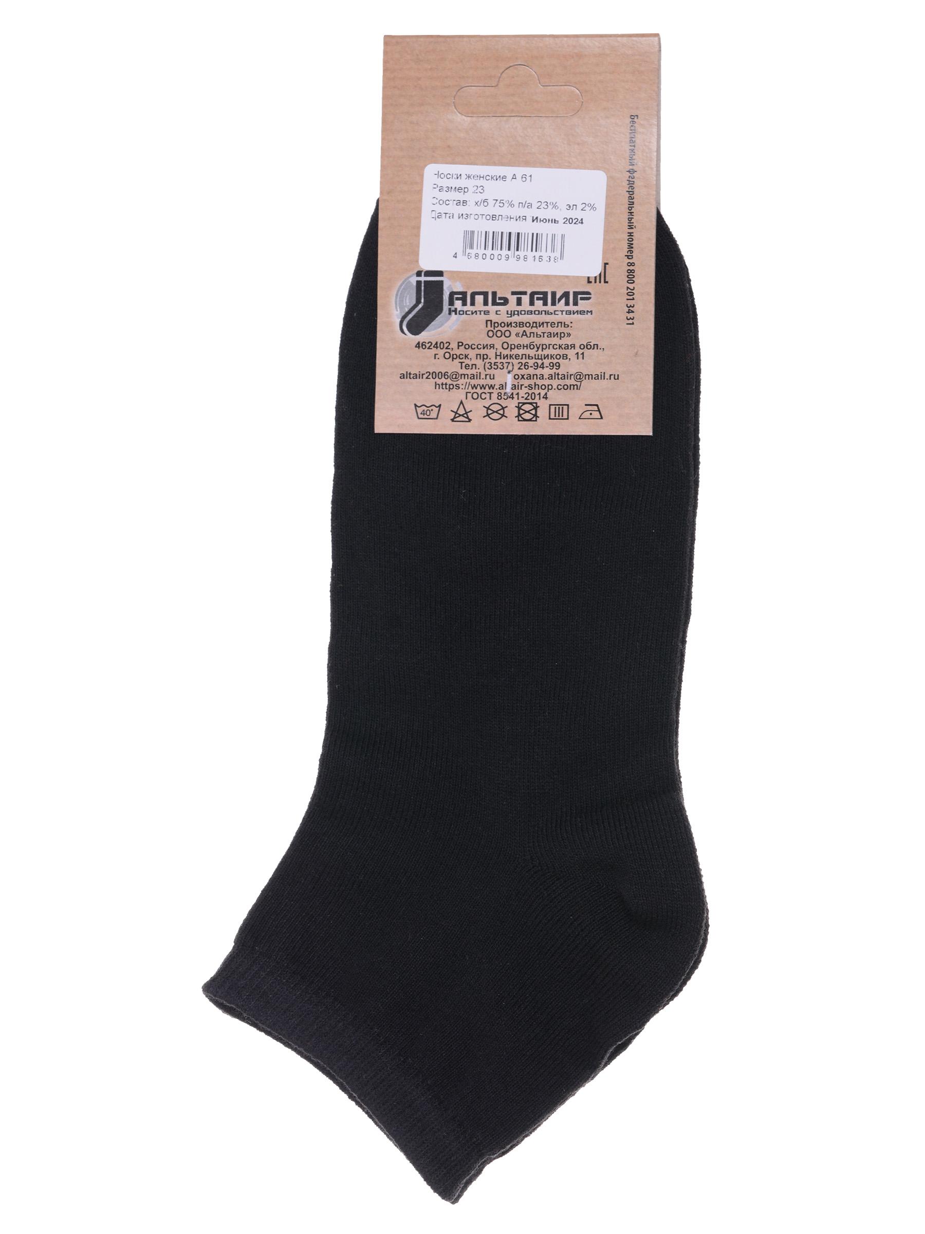 Комплект женских носков из 5 пар, летние, короткие, цвет черный, классические, шов обычный (не бесшовные), принт (рисунок): без рисунков/узоров, состав: 75% хлопок, 23% полиамид, 2% эластан, арт. 5-А61. Производитель «ООО Альтаир, г. Орск, Оренбургская обл, Россия» под брендом «Альтаир».