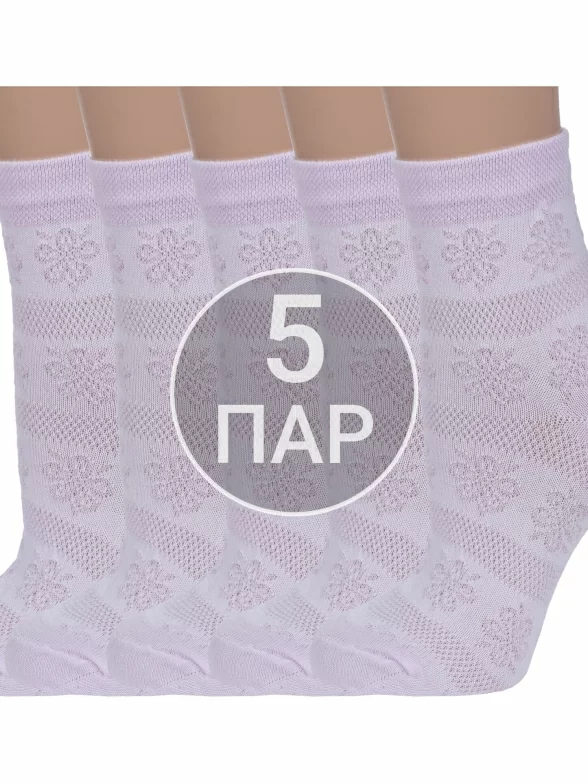 Комплект женских носков из 5 пар, летние или круглогодичные, укороченные, цвет сиреневый, повседневные, в сеточку, шов обычный (не бесшовные), принт (рисунок): цветы / растения, кружево (или имитация), с узором, состав: 80% хлопок, 18% полиамид, 2% эластан, арт. 5-С117. Производитель «ООО Альтаир, г. Орск, Оренбургская обл, Россия» под брендом «Альтаир».