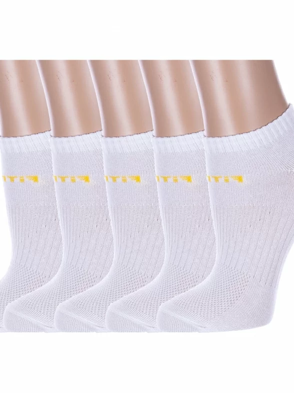 Комплект женских носков из 5 пар, круглогодичные, короткие, цвет белый с желтым, спортивные, в сеточку, шов обычный (не бесшовные), принт (рисунок): надписи, с узором, состав: 75% хлопок, 23% полиамид, 2% эластан, арт. 5-А217. Производитель «ООО Альтаир, г. Орск, Оренбургская обл, Россия» под брендом «Альтаир».