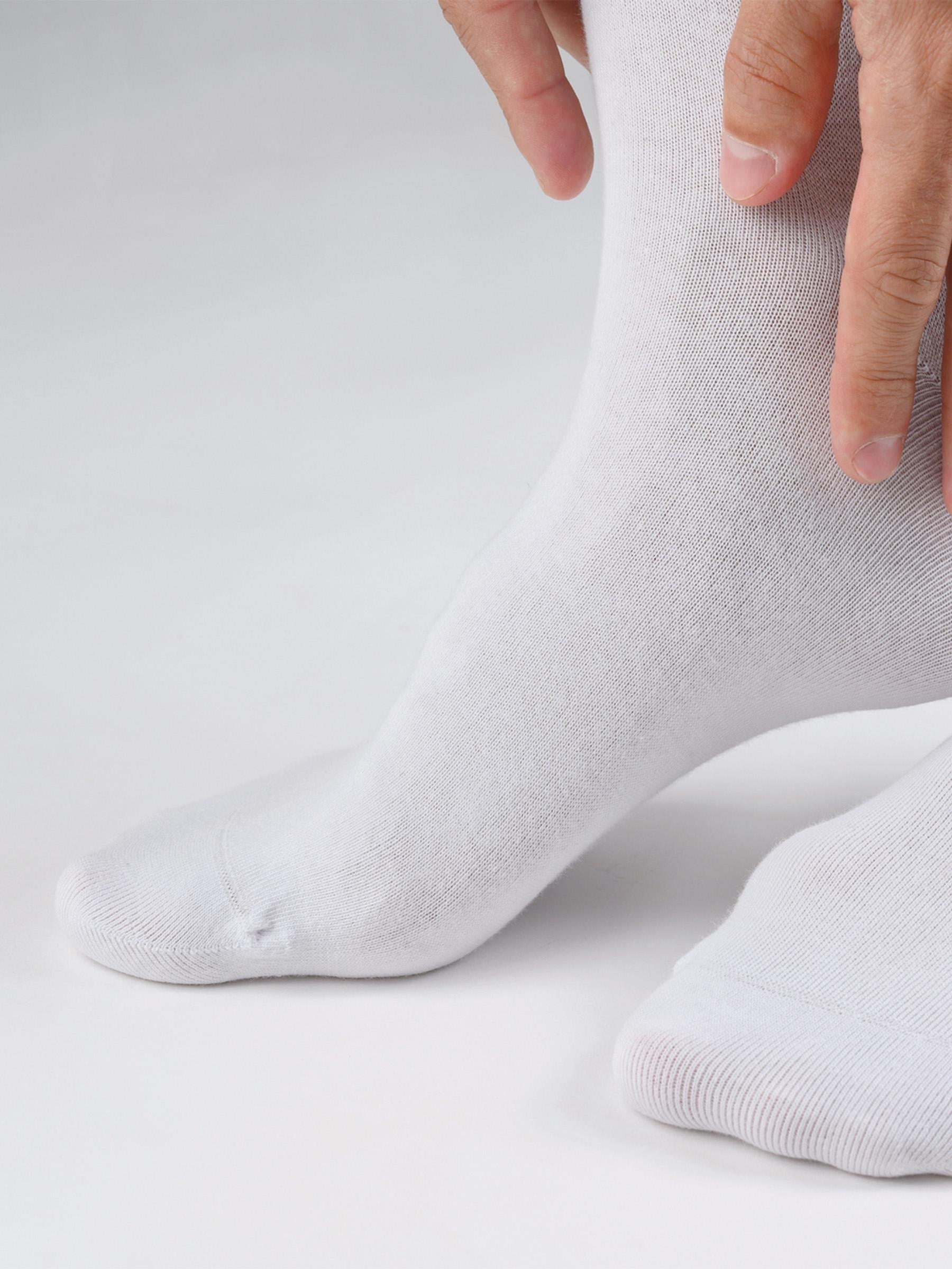 Однотонная модель средней длины с одинарным бортом (манжетом резинки) и неощутимым швом на мыске. Изготовлены на фабрике "Орудьевский трикотаж" в Московской области из хлопка с добавлением полиамида и эластана для износостойкости изделия и комфортной посадки.