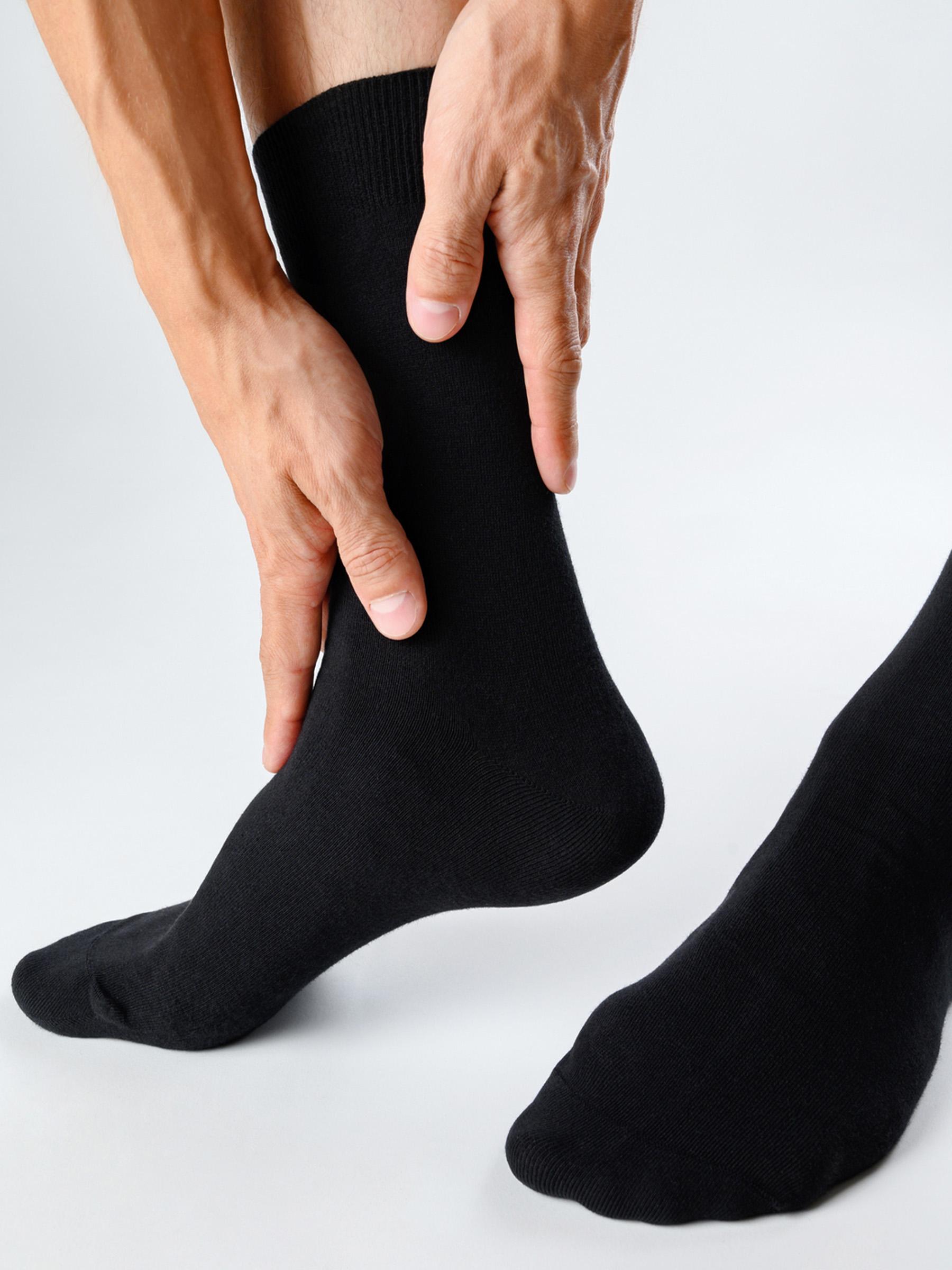 Однотонная модель средней длины с одинарным бортом (манжетом резинки) и неощутимым швом на мыске. Изготовлены на фабрике "Орудьевский трикотаж" в Московской области из хлопка с добавлением полиамида и эластана для износостойкости изделия и комфортной посадки.