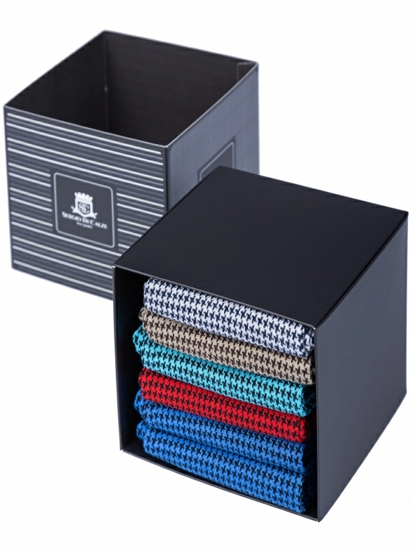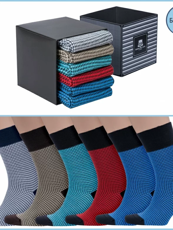 Набор состоит из 6 пар носков артикула 17SC5: по 1 паре бирюзовых, светло-голубых, коричневых, красных и 2 пары синих. Носки сложены в фирменную коробку-кубик, которая дополнительно упакована в плотный транспортный картон для сохранности при доставке.