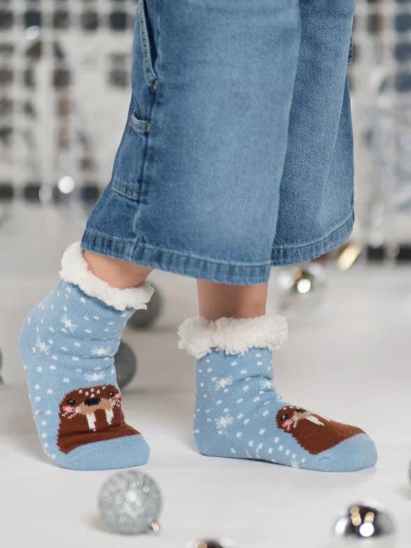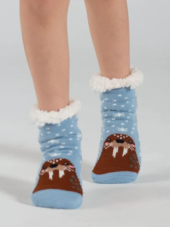 Межсезонные или зимние средней длины детские носки, цвет голубой, с нескользящей стопой, махровые, шов обычный (не бесшовные), принт (рисунок): животные, состав: 97% хлопок, 3% полиуретан, арт. PK548. Производитель «Oemen» Китай .