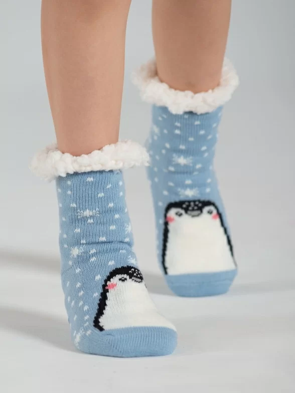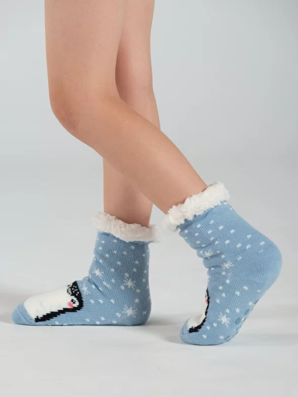 Межсезонные или зимние средней длины детские носки, цвет голубой, с нескользящей стопой, махровые, шов обычный (не бесшовные), принт (рисунок): животные, состав: 97% хлопок, 3% полиуретан, арт. PK550. Производитель «Oemen» Китай .