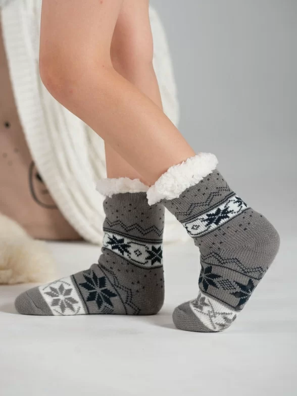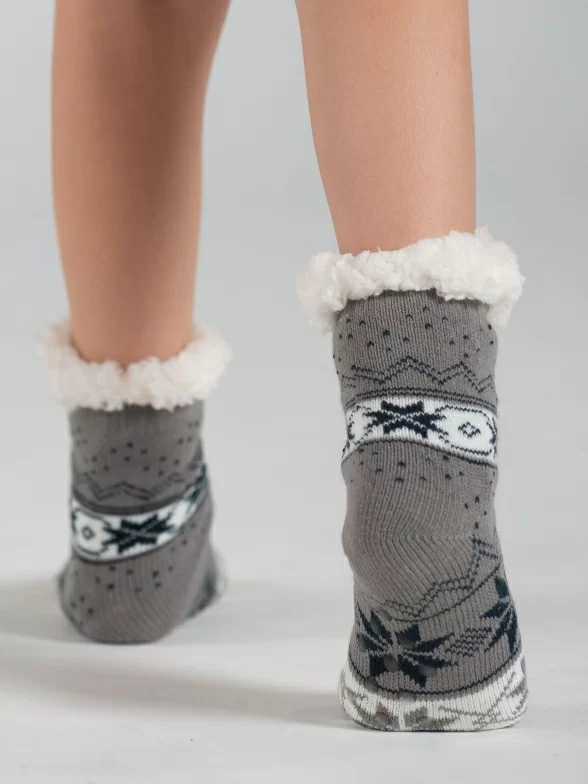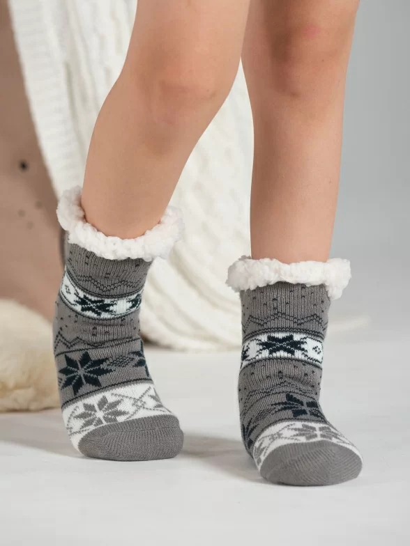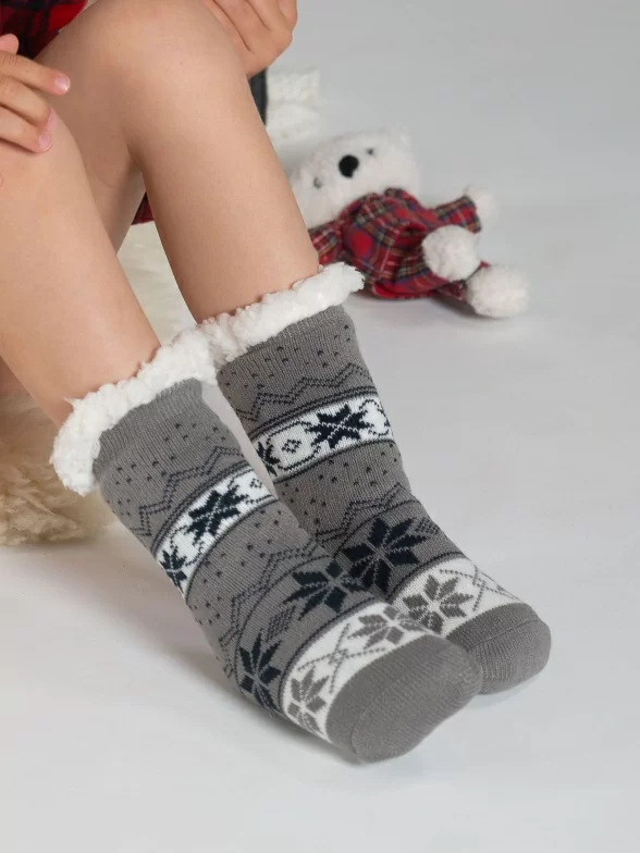 Межсезонные или зимние средней длины детские носки, цвет серый, с нескользящей стопой, махровые, шов обычный (не бесшовные), принт (рисунок): орнамент, состав: 97% хлопок, 3% полиуретан, арт. PK236. Производитель «Oemen» Китай .