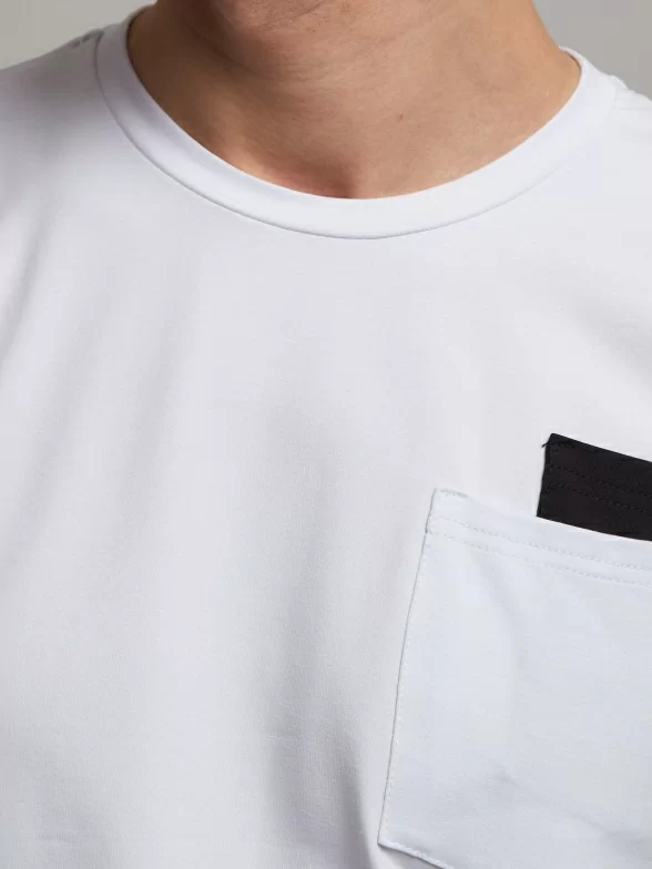Модель однотонного белого цвета с круглым воротом и с двойным пришивным кармашком на груди; внизу изделия имеется нашивка с логотипом бренда. Классический крой и строгий дизайн помогут подчеркнуть Ваш любой образ.