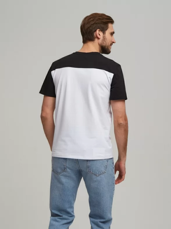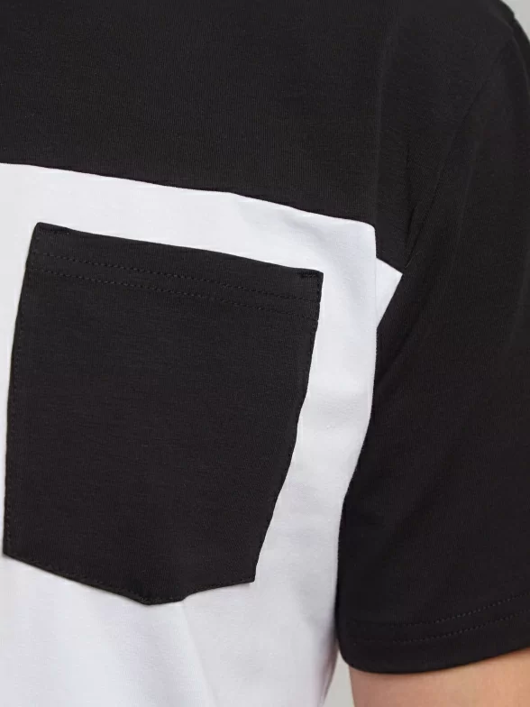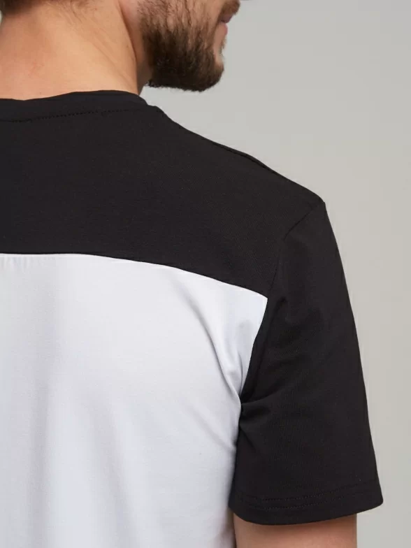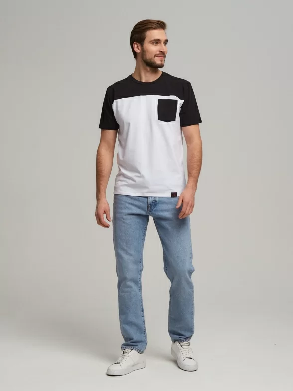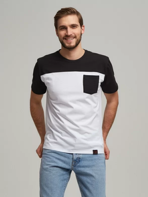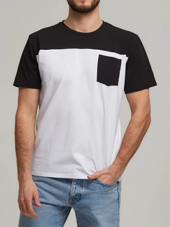 Двухцветная модель с круглым воротом и пришивным контрастным кармашком на на груди; также имеется нашивка с логотипом внизу изделия. Классический крой и строгий дизайн помогут подчеркнуть Ваш любой образ.