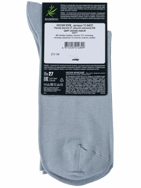 Пара серых носков артикула 7С-94СП поставляется с фабричной этикеткой в обычном или курьер-пакете.