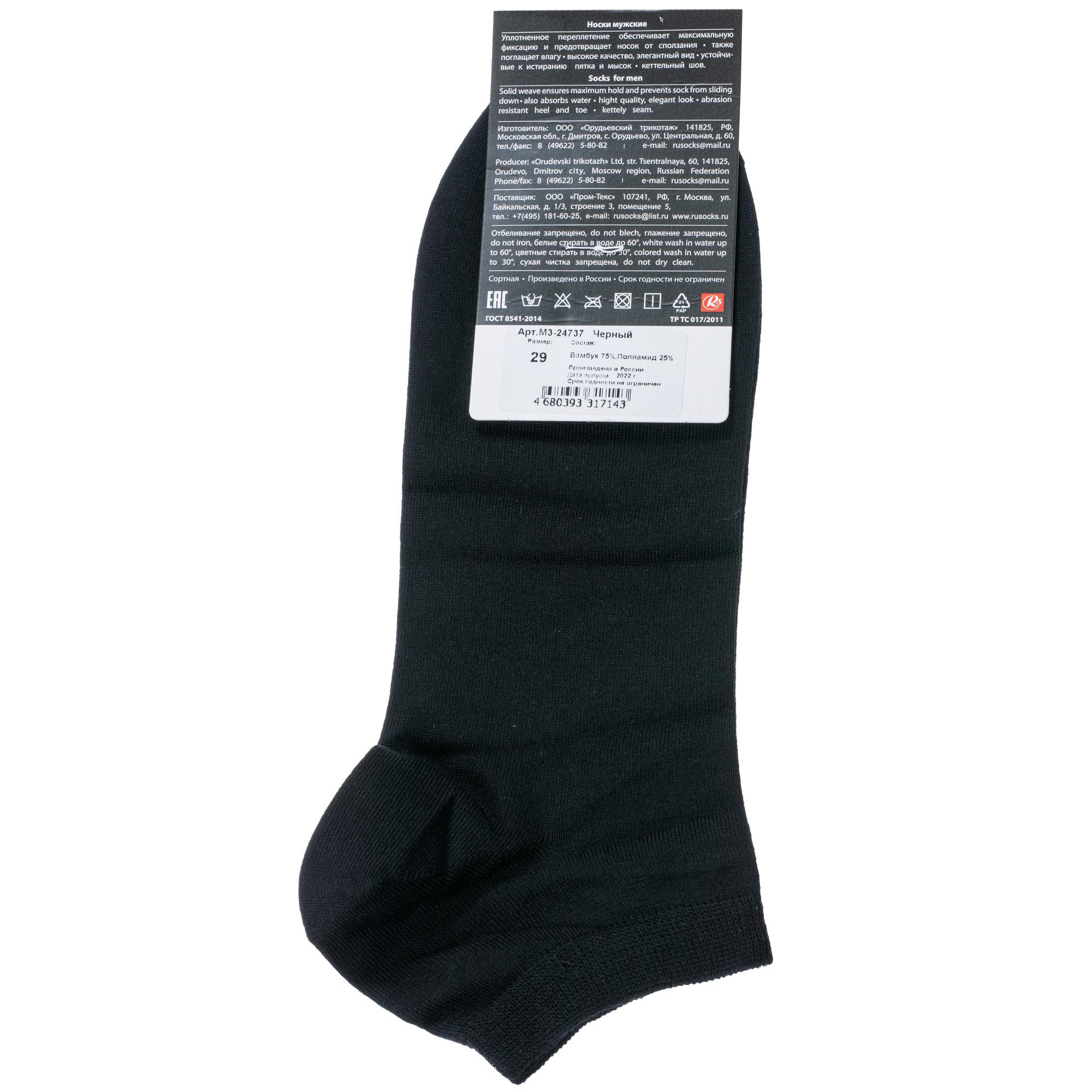 Летние короткие мужские носки, цвет черный, классические, шов кеттельный (бесшовная технология), принт (рисунок): однотонный, без рисунков/узоров, состав: 75% бамбук, 25% полиамид, арт. М3-24737. Производитель «ООО Орудьевский трикотаж, Россия» под брендом «Rusocks (орудьевский трикотаж)».