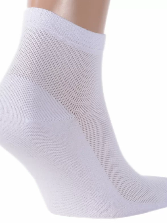 Летние короткие мужские носки, цвет белый, в сеточку, спортивные, классические, шов кеттельный (бесшовная технология), принт (рисунок): однотонный, без рисунков/узоров, состав: 86% хлопок, 11% полиамид, 3% эластан, арт. М-237. Производитель «ООО Орудьевский трикотаж, Россия» под брендом «Rusocks (орудьевский трикотаж)».