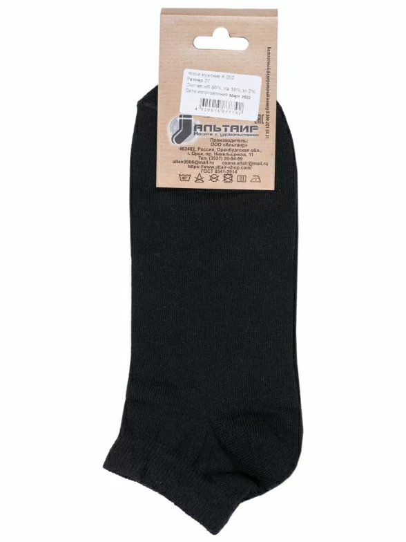 Круглогодичные короткие мужские носки, цвет черный, спортивные, классические, шов обычный (не бесшовные), принт (рисунок): однотонный, без рисунков/узоров, состав: 80% хлопок, 18% полиамид, 2% эластан, арт. А202. Производитель «ООО Альтаир, г. Орск, Оренбургская обл, Россия» под брендом «Альтаир».