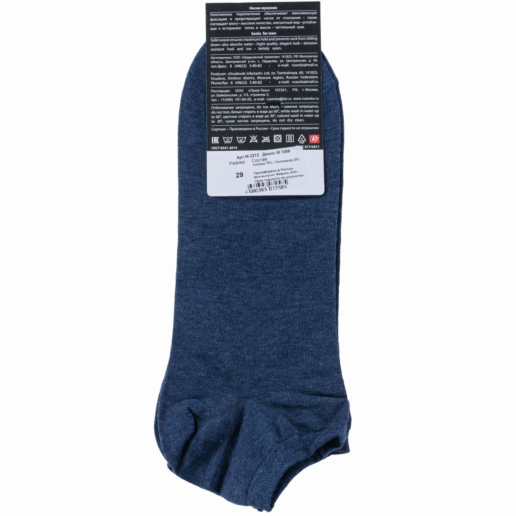 Летние короткие мужские носки, цвет синий-джинс, спортивные, классические, шов кеттельный (бесшовная технология), принт (рисунок): однотонный, без рисунков/узоров, состав: 75% хлопок, 25% полиамид, арт. М-2212. Производитель «ООО Орудьевский трикотаж, Россия» под брендом «Rusocks (орудьевский трикотаж)».
