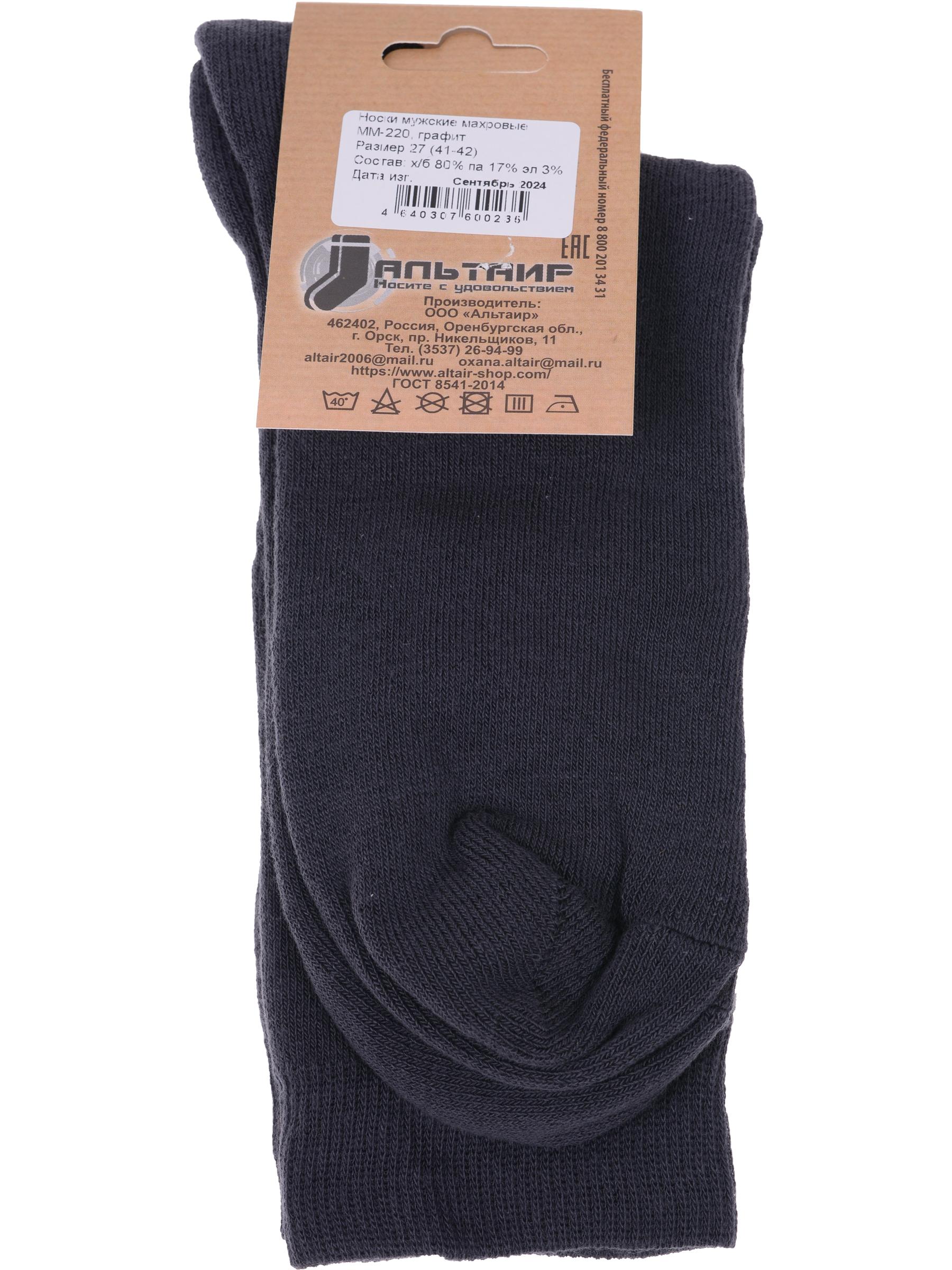 Межсезонные средней длины мужские носки, цвет темно-серый, махровые, шов обычный (не бесшовные), принт (рисунок): однотонный, без рисунков/узоров, состав: 80% хлопок, 17% полиамид, 3% эластан, арт. ММ-220. Производитель «ООО Альтаир, г. Орск, Оренбургская обл, Россия» под брендом «Альтаир».