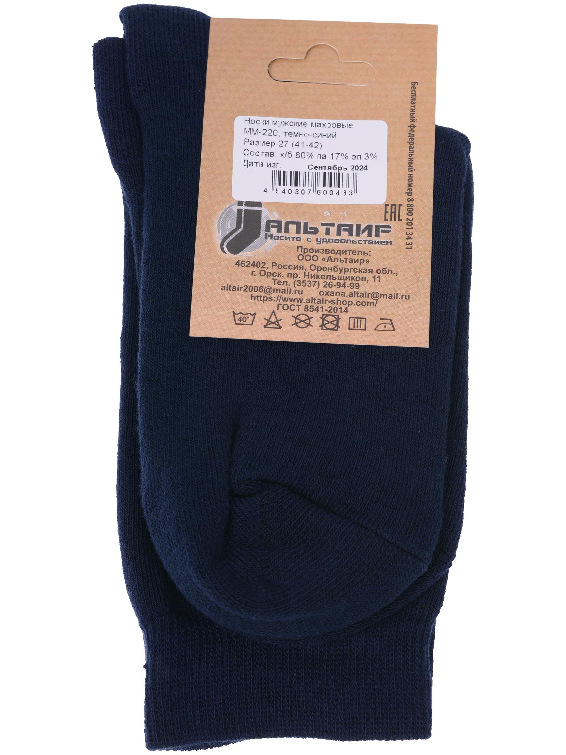 Межсезонные средней длины мужские носки, цвет темно-синий, махровые, шов обычный (не бесшовные), принт (рисунок): однотонный, без рисунков/узоров, состав: 80% хлопок, 17% полиамид, 3% эластан, арт. ММ-220. Производитель «ООО Альтаир, г. Орск, Оренбургская обл, Россия» под брендом «Альтаир».