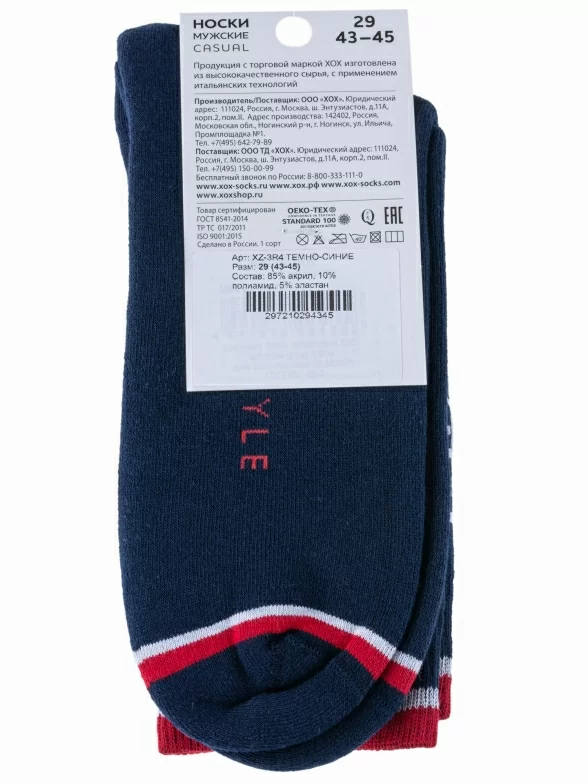Пара темно-синих носков артикула XZ-3R4 поставляется с индивидуальной фабричной этикеткой в плотном пластиковом пакете.