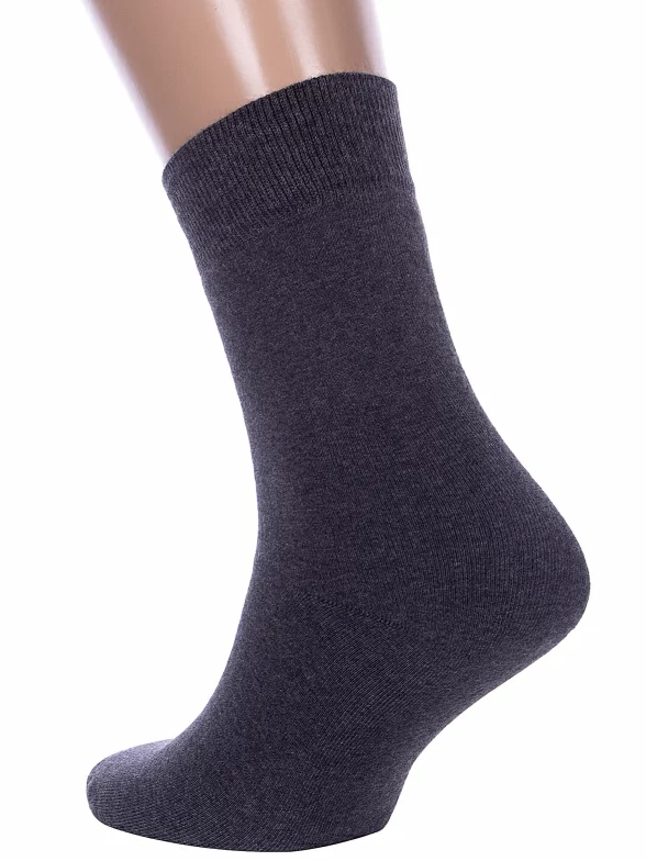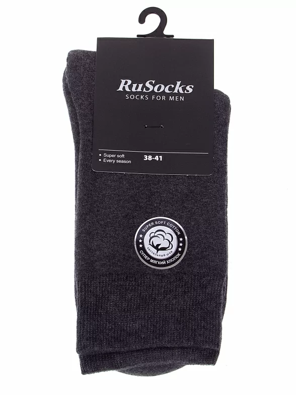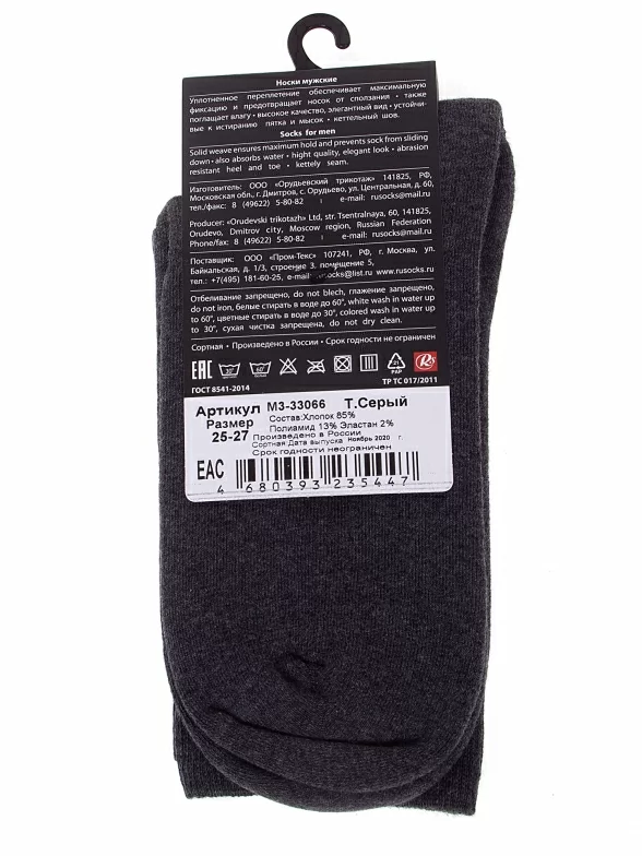 Межсезонные или зимние средней длины мужские носки, цвет темно-серый, теплые, махровые, классические, шов кеттельный (бесшовная технология), принт (рисунок): однотонный, без рисунков/узоров, состав: 85% хлопок, 13% полиамид, 2% эластан, арт. М3-33066. Производитель «ООО Орудьевский трикотаж, Россия» под брендом «Rusocks (орудьевский трикотаж)».